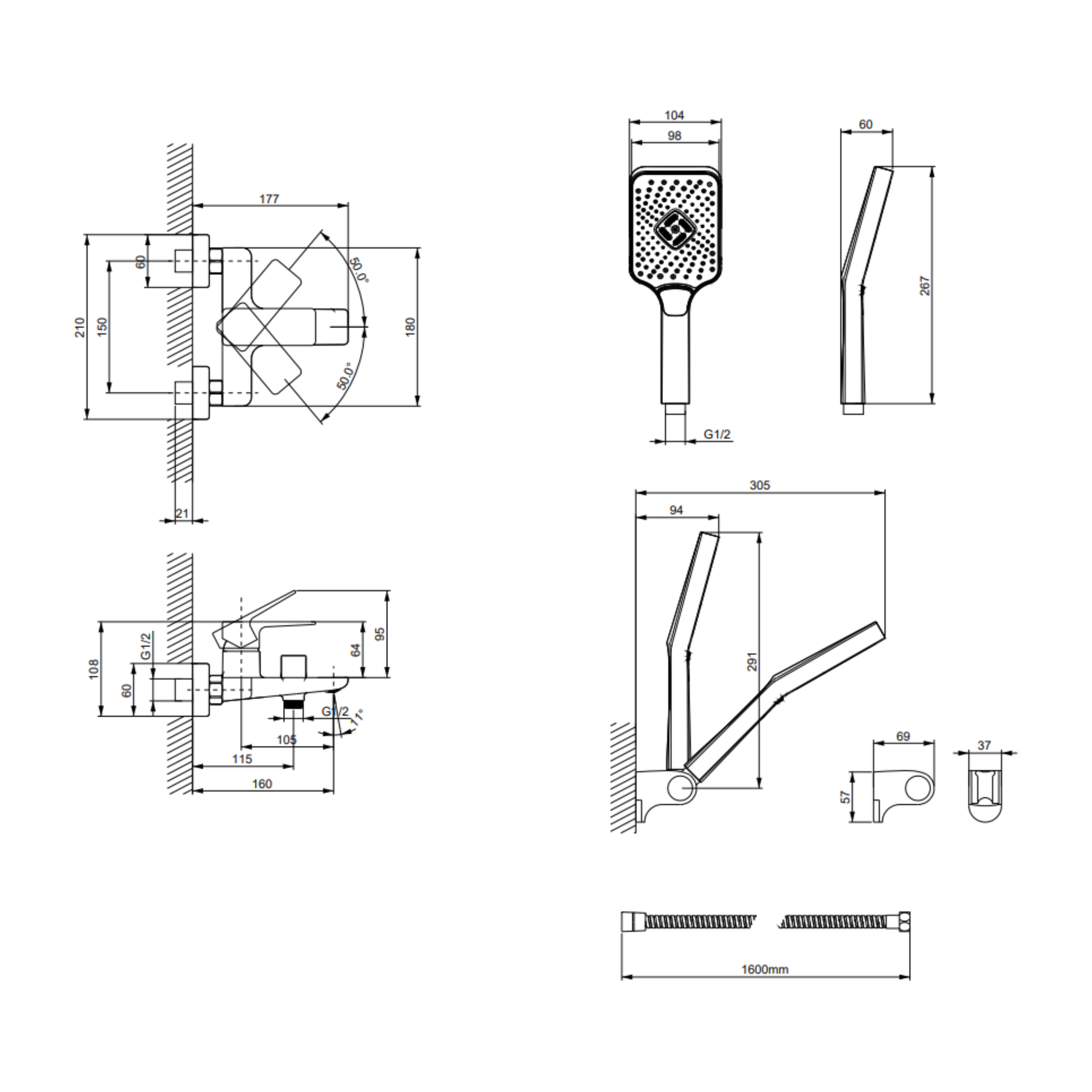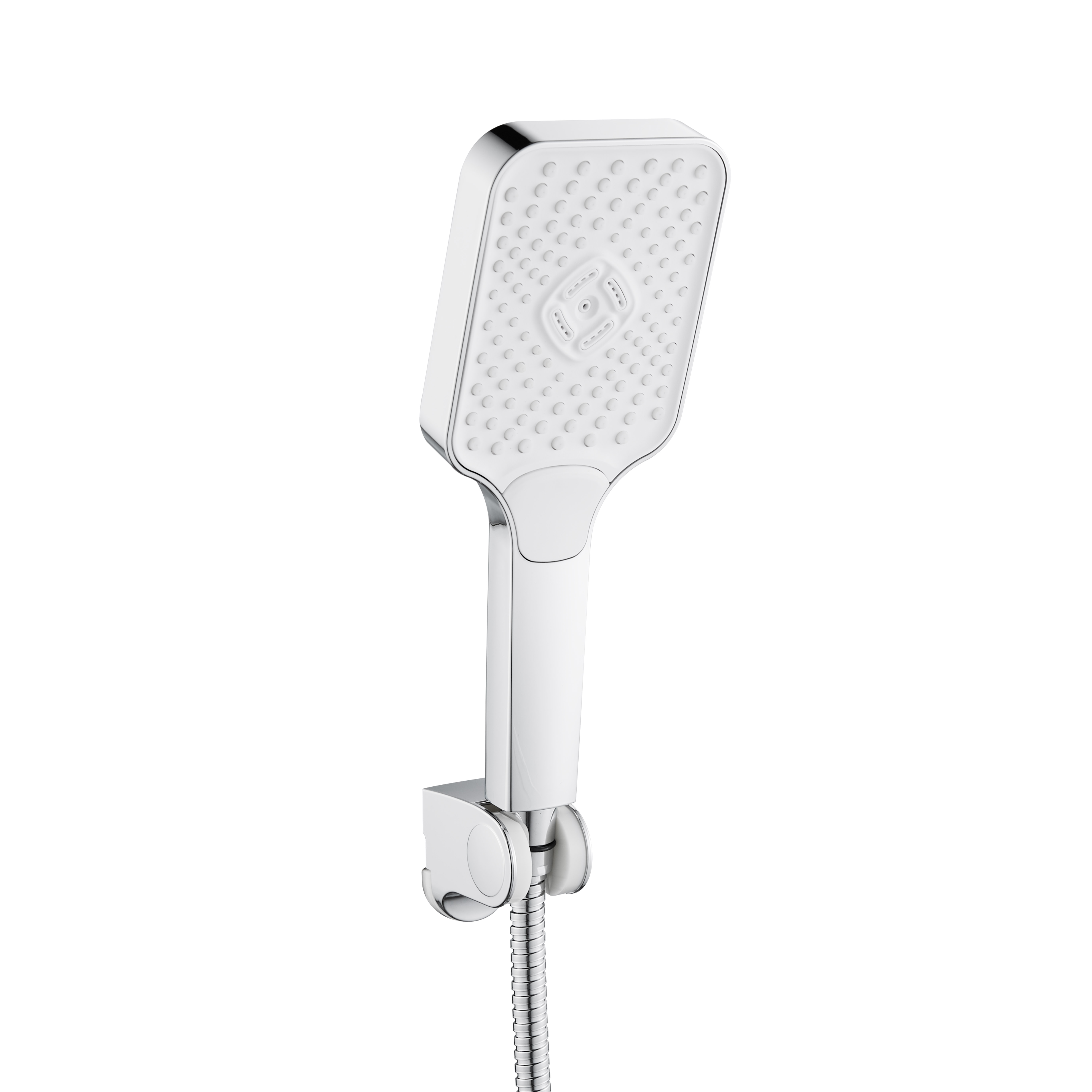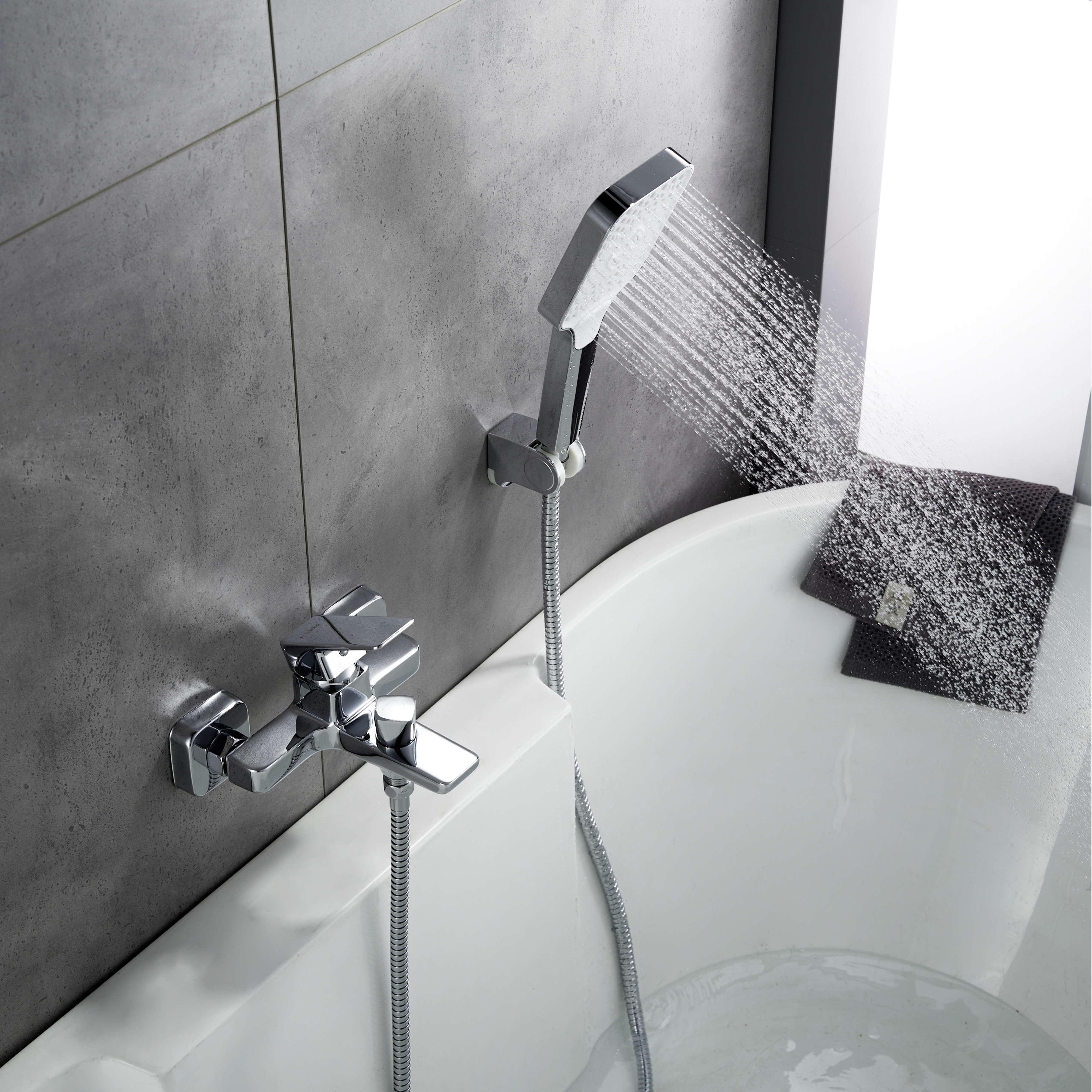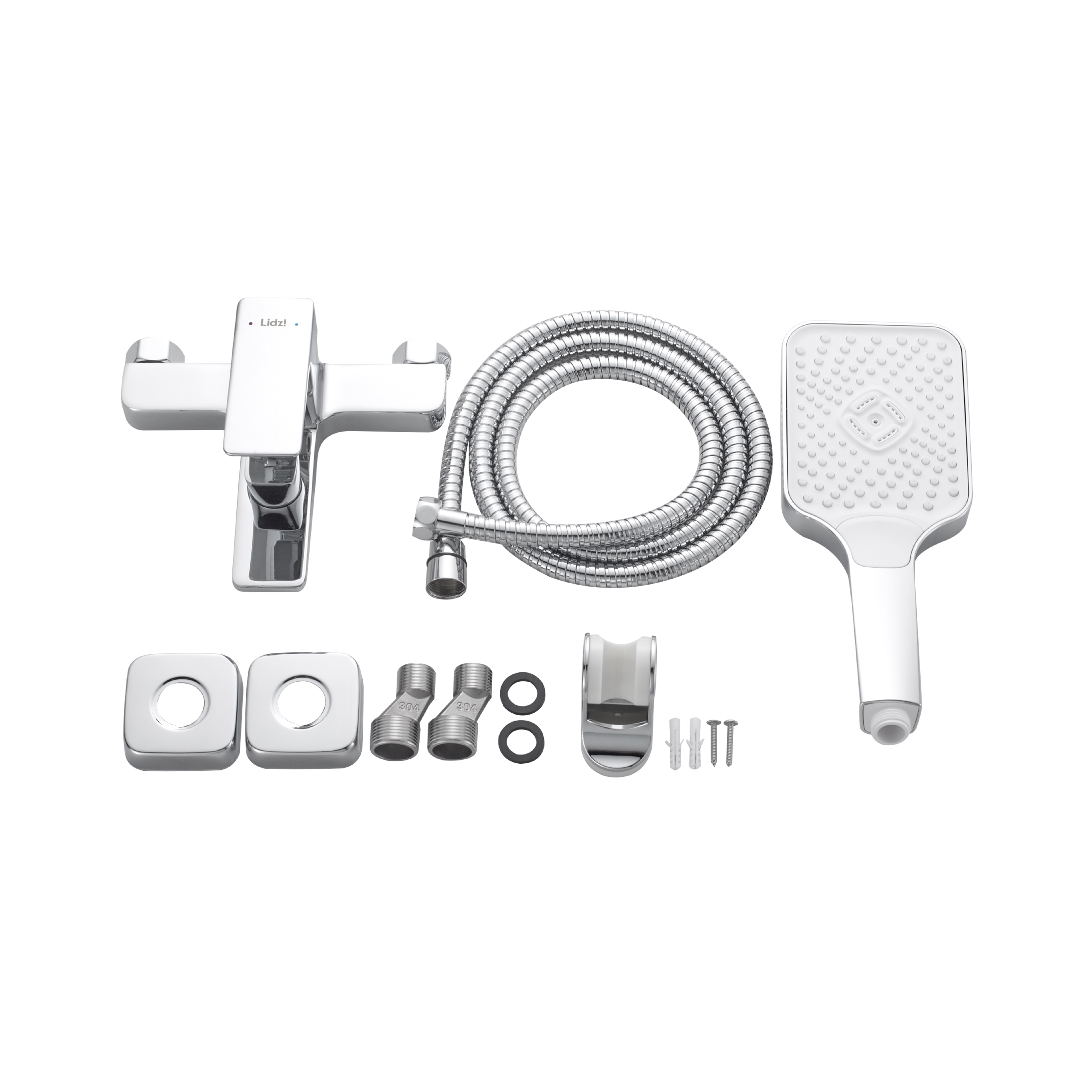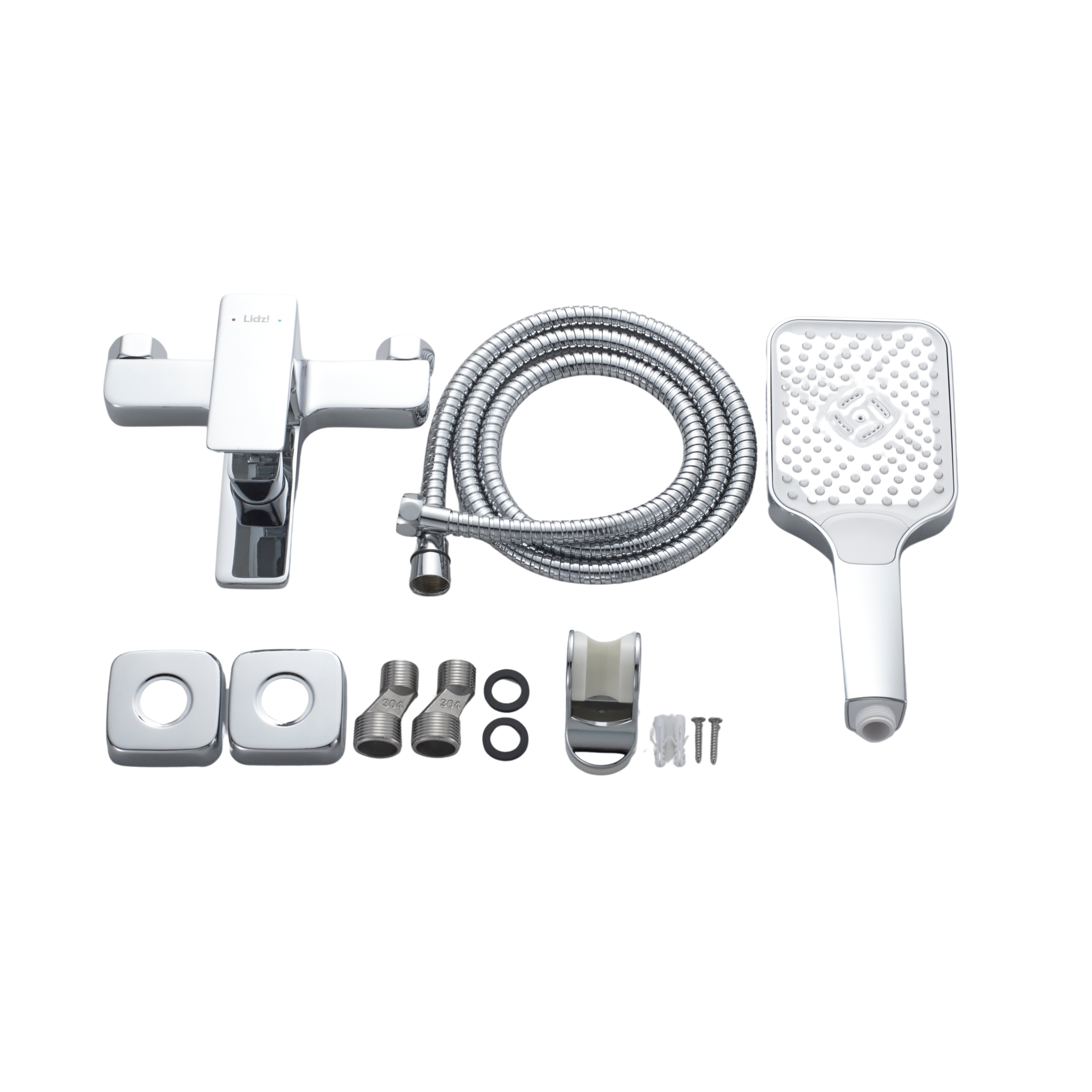 Смеситель, душевой шланг, ручная лейка, декоративные чашки (розетки) - 2 шт, эксцентрики (переходники) - 2 шт, уплотнительные прокладки - 2 шт, держатель для душа, крепёж для держателя.