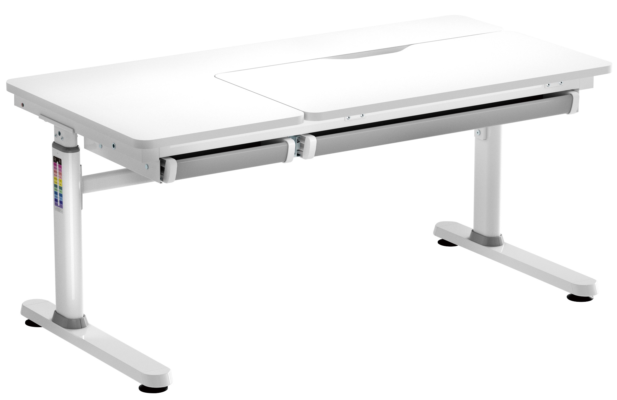 Стіл 2E CE301 стане в пригоді для навчання та творчості. Виріб зручний і надійний за щоденного користування. Розмір становить 1 200 × 600 мм, можна регулювати за висотою від 540 до 760 мм. Стільниця нахиляється до 50° – це зручно під час письма, читання чи малювання. Нахильна частина 800 × 400 мм, стільниця завтовшки – 18 мм. Витримує навантаження до 100 кг. Оснащено ручкою-кривошипом, пневмомеханізмом, захистом від защемлення пальців, шухлядою, гачком для речей і ніжками-локерами. Поверхня матова, біла, не відблискує.
