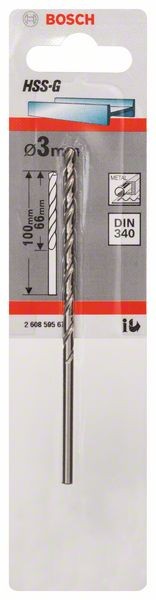 Характеристики Свердло по металлу HSS-G, DIN 340, 3x66x100 мм, BOSCH код товару 2608595676