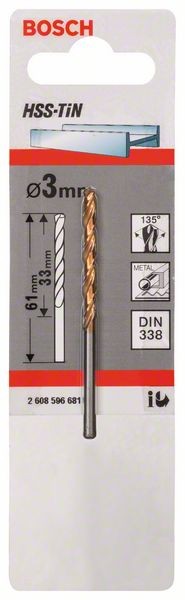 Описание Свердло по металлу HSS-TiN, DIN 338, 3 x 33 x 61 мм BOSCH код товару 2608596681