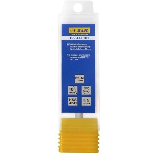 Описание Сверло ступенчатое S&R HSS-TiN 4-32 мм код товару 109432101