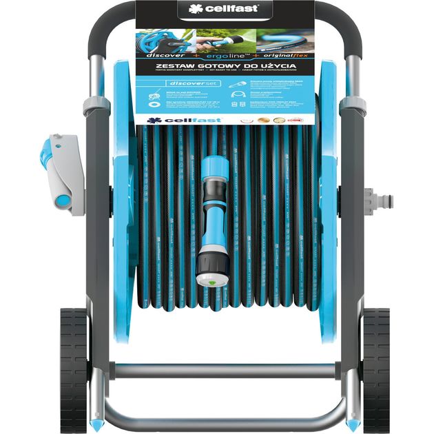 Характеристики Тележка для шланга DISCOVER, шланг ORIGINAL FLEX 1/2 25 м, ороситель ERGO, коннектор ERGO 1/2, коннектор ERGO 1/2 CELLFAST. код товару 55-625