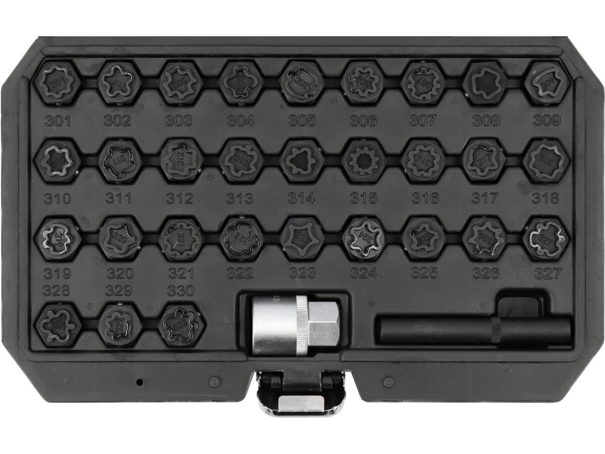 Описание Торцеві вставки до захисних гвинтів колісних дисків авто Mercedes YATO з квадрат- 1/2", компл. 32 шт код товару YT-060390