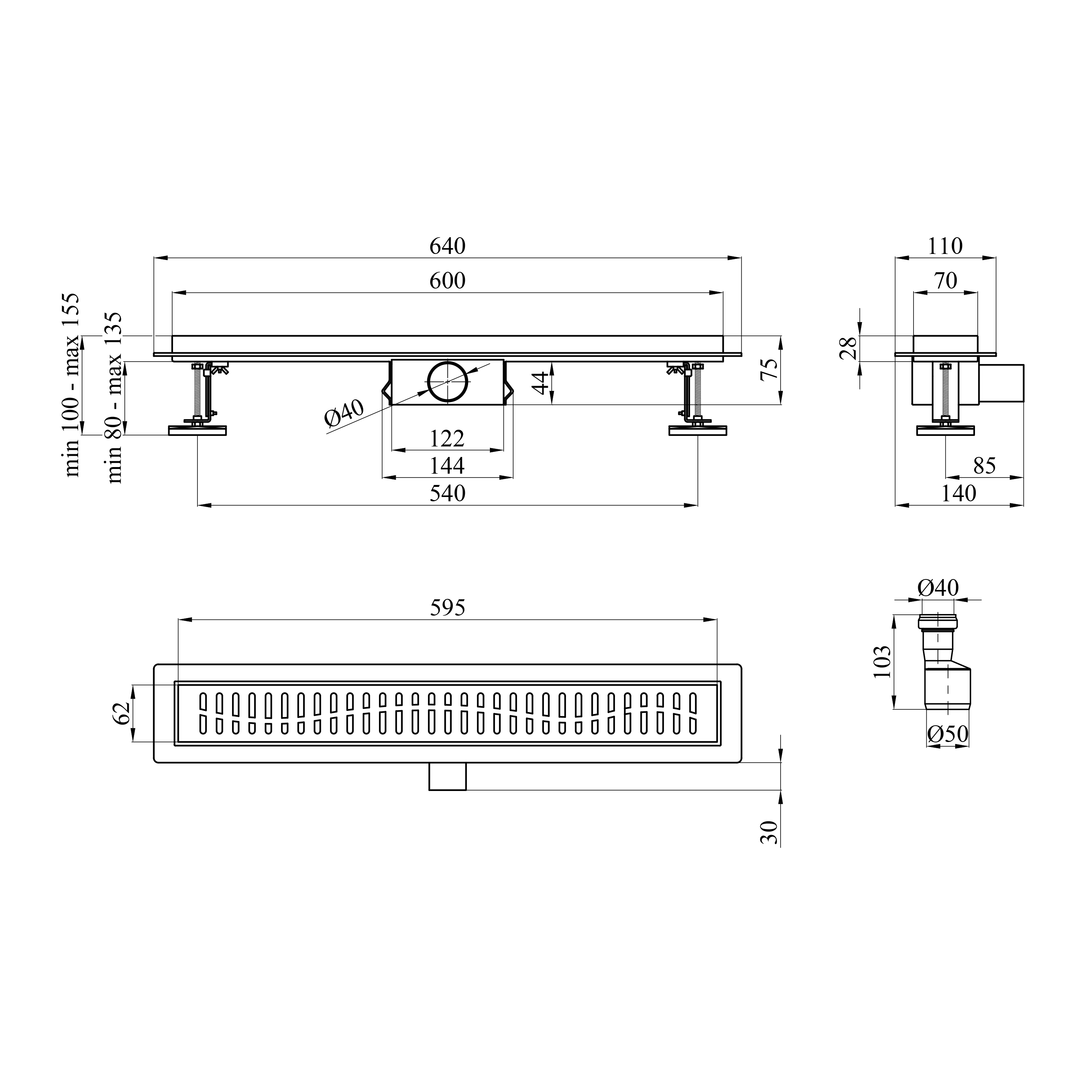 Трап, решётка, ножки, гидроизоляционная лента, редукция, монтажный крючок.