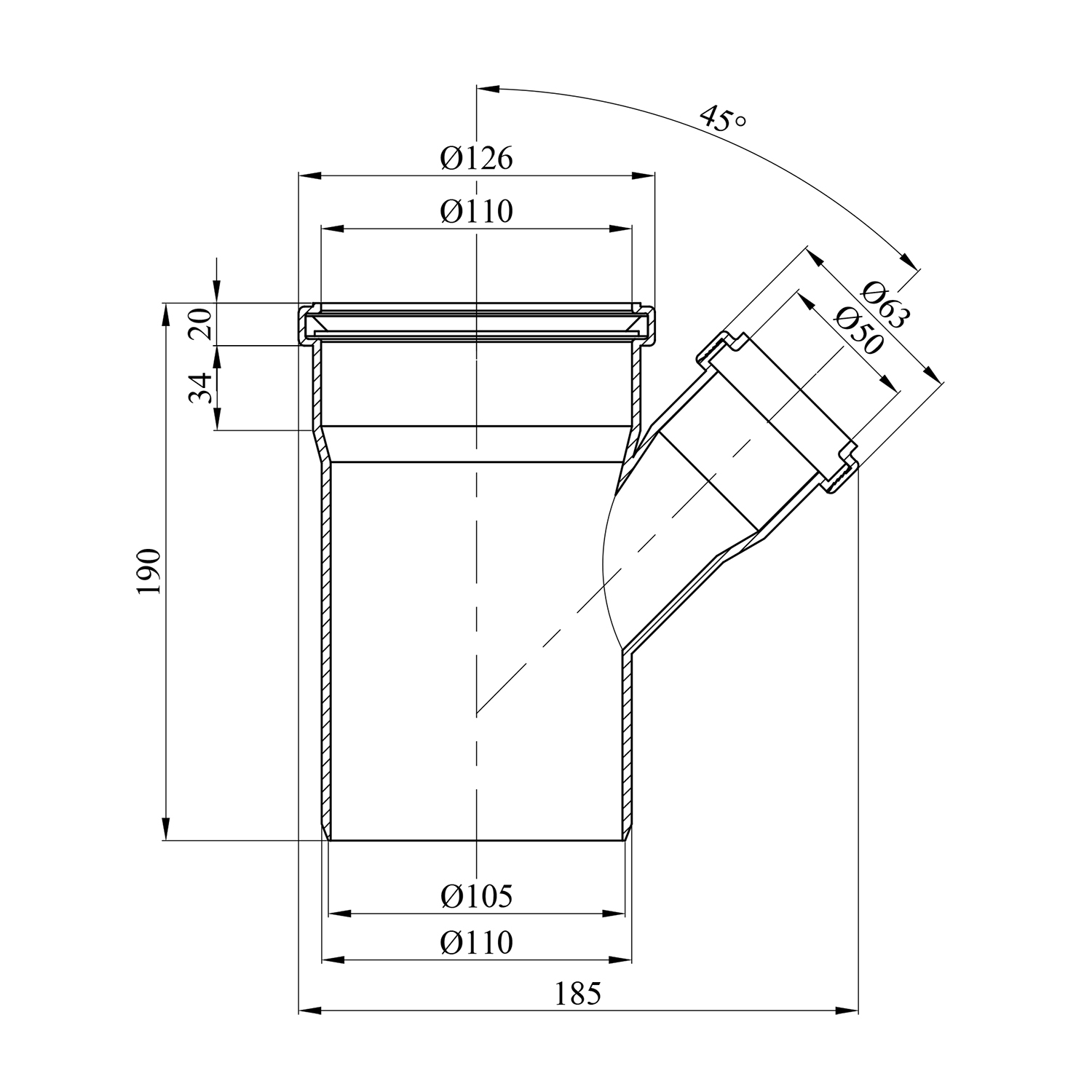 Тройник Rozma для внутренней канализации 100х50/45°