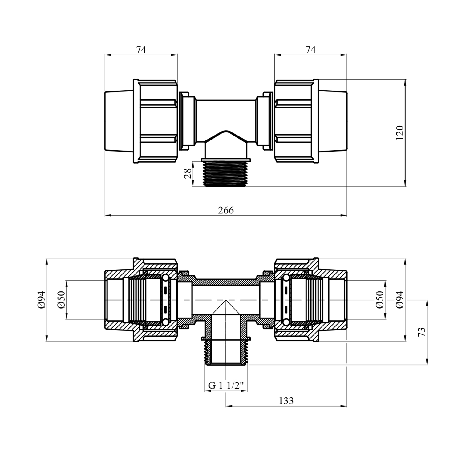 Характеристики Тройник ПЭ Rozma 50x1 1/2x50 РН код товару CV023337