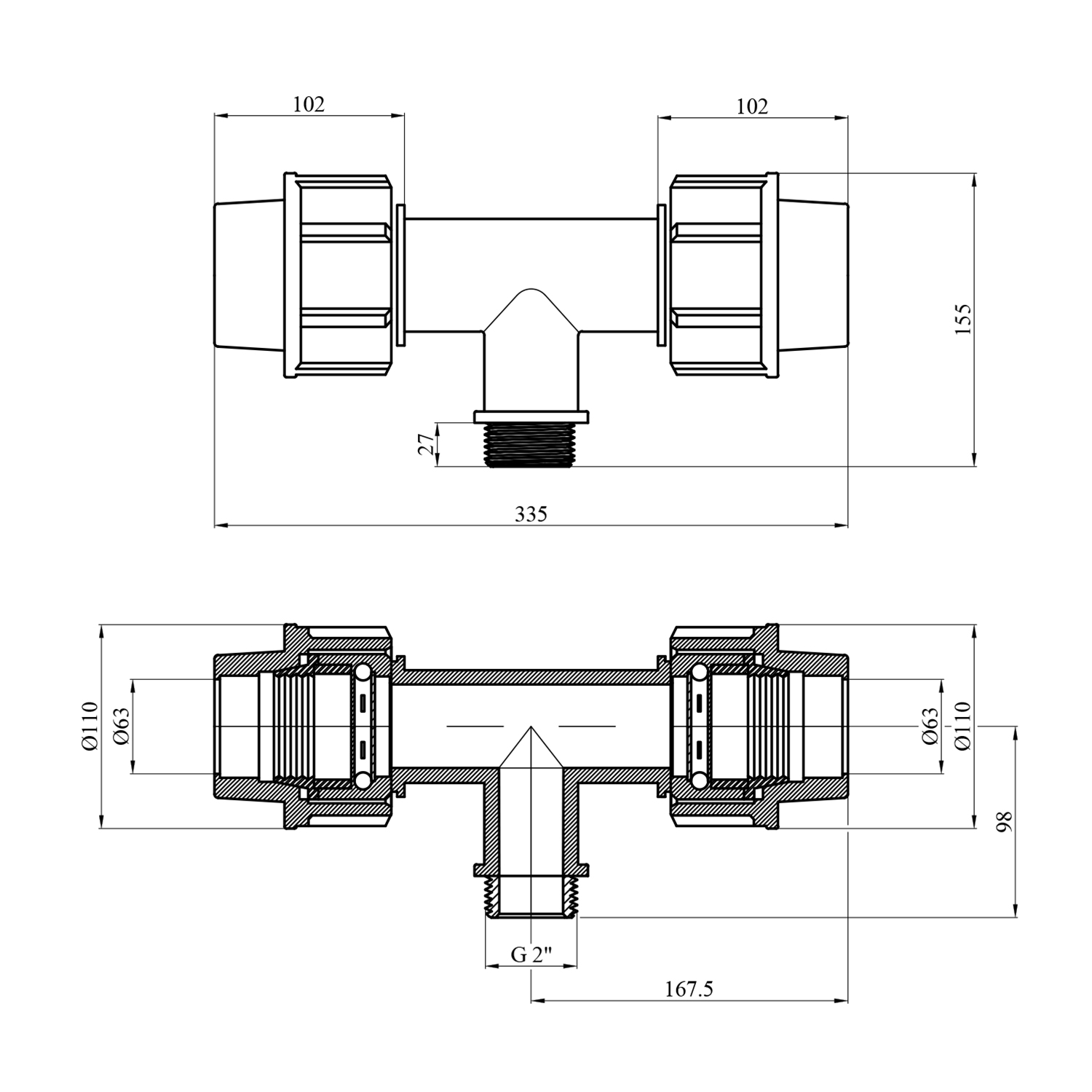 Характеристики Тройник ПЭ SantehPlast 63х2"х63 РН код товару CV020733
