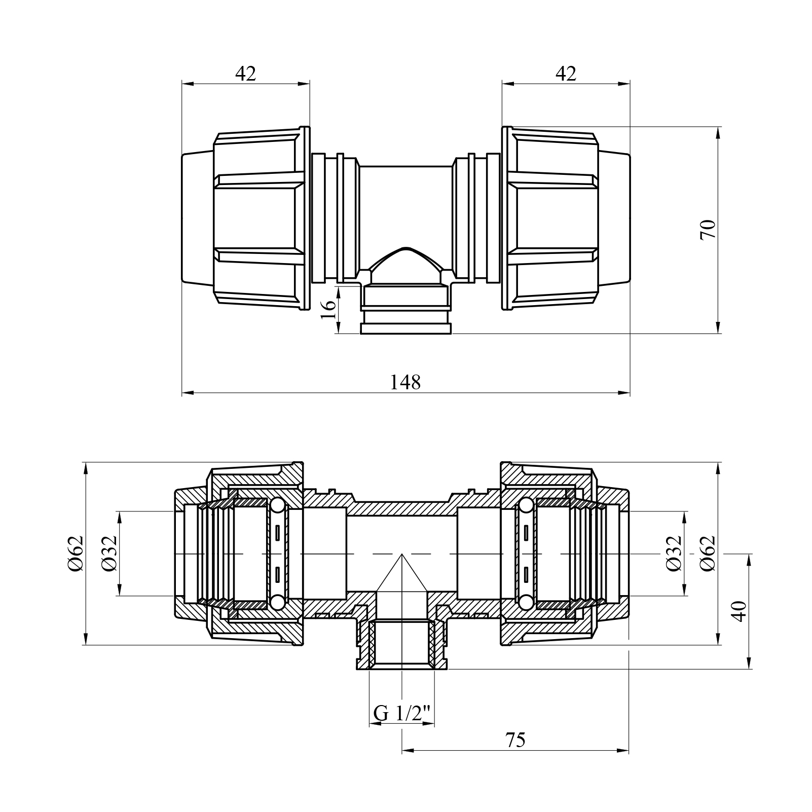 Характеристики Тройник ПЭ SPT 32х1/2х32 РВ код товару CV024729