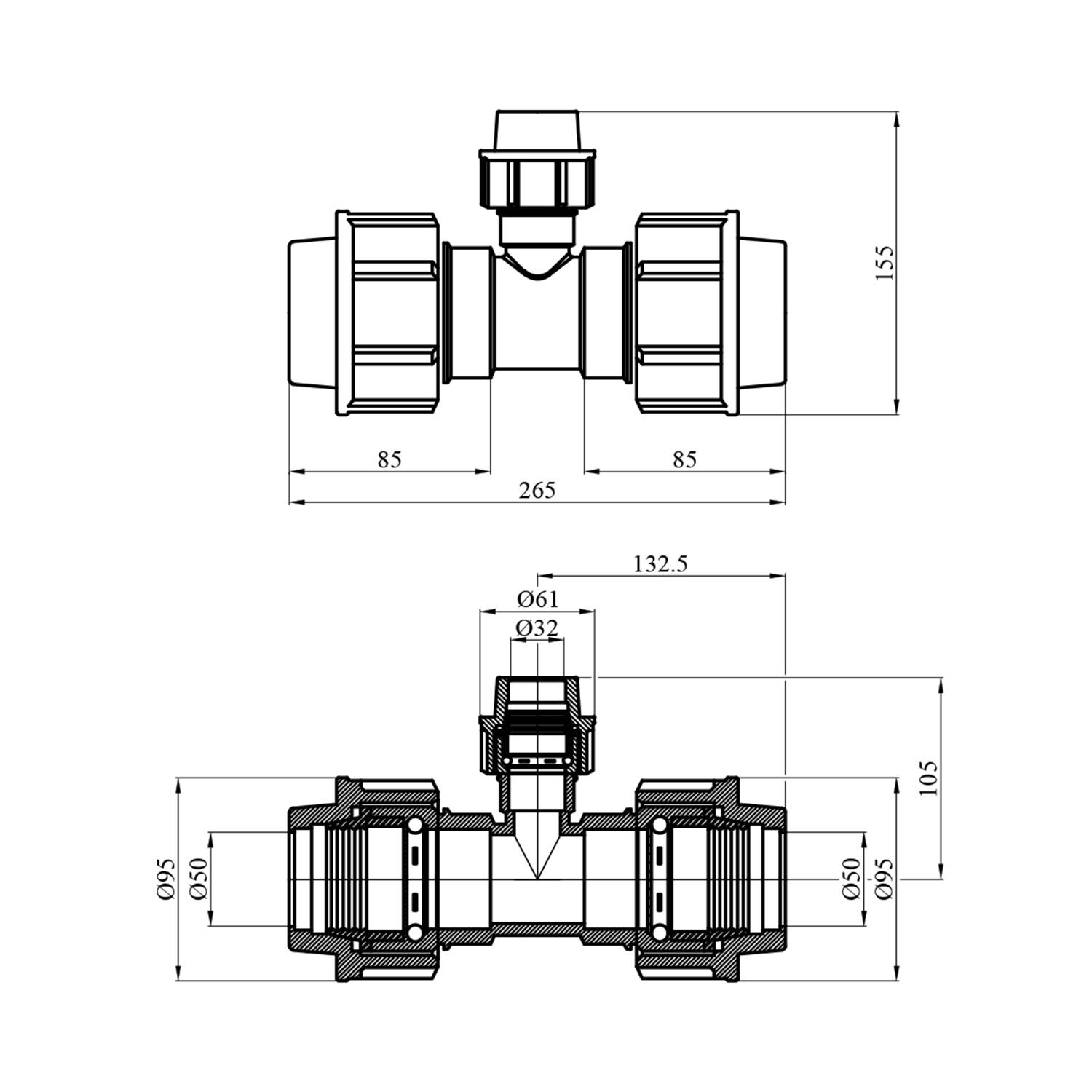Характеристики Тройник редукционный ПЭ SantehPlast 50х32х50 мм код товару CV022584