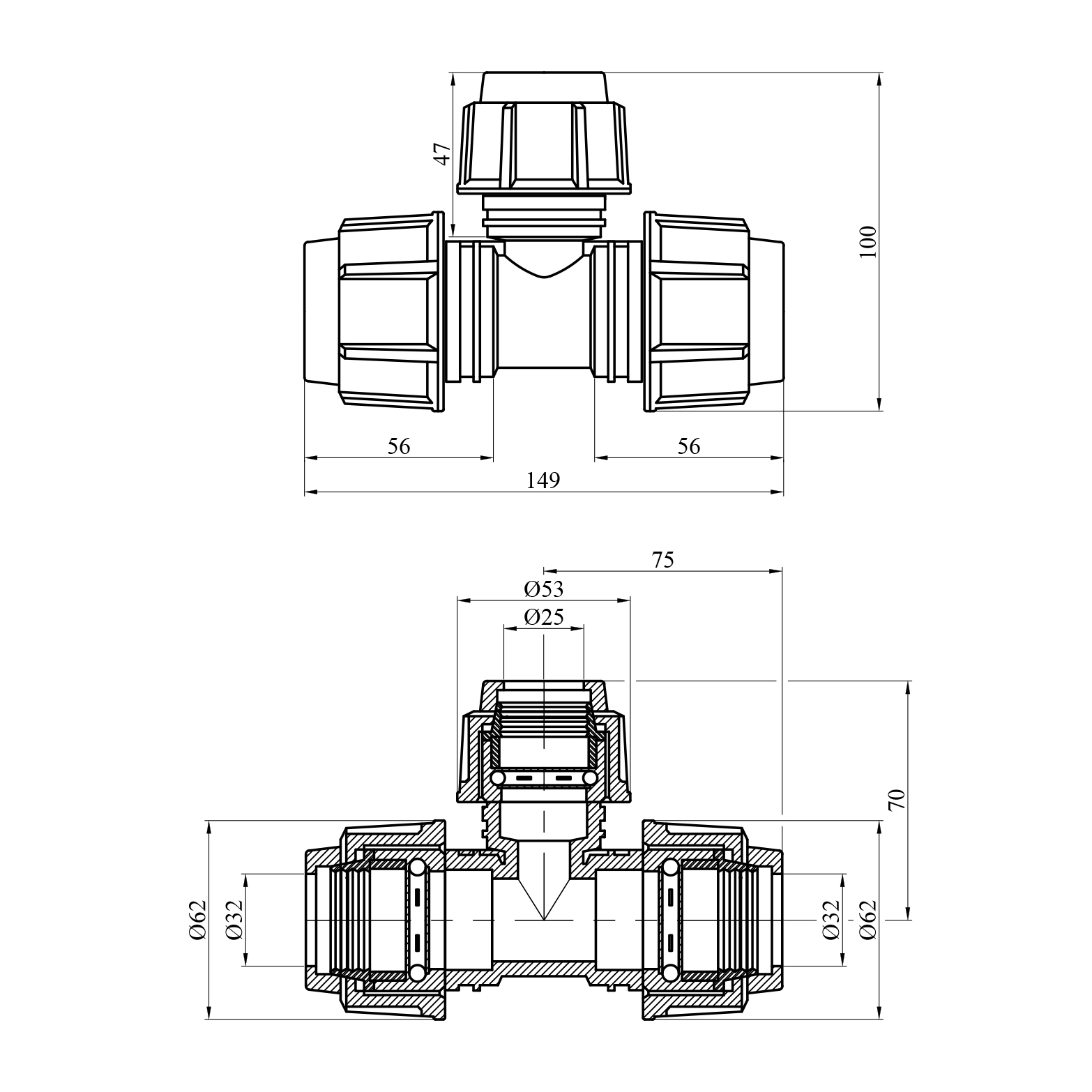 Характеристики Редукционный тройник ПЭ SPT 32х25х32 мм код товару CV024718