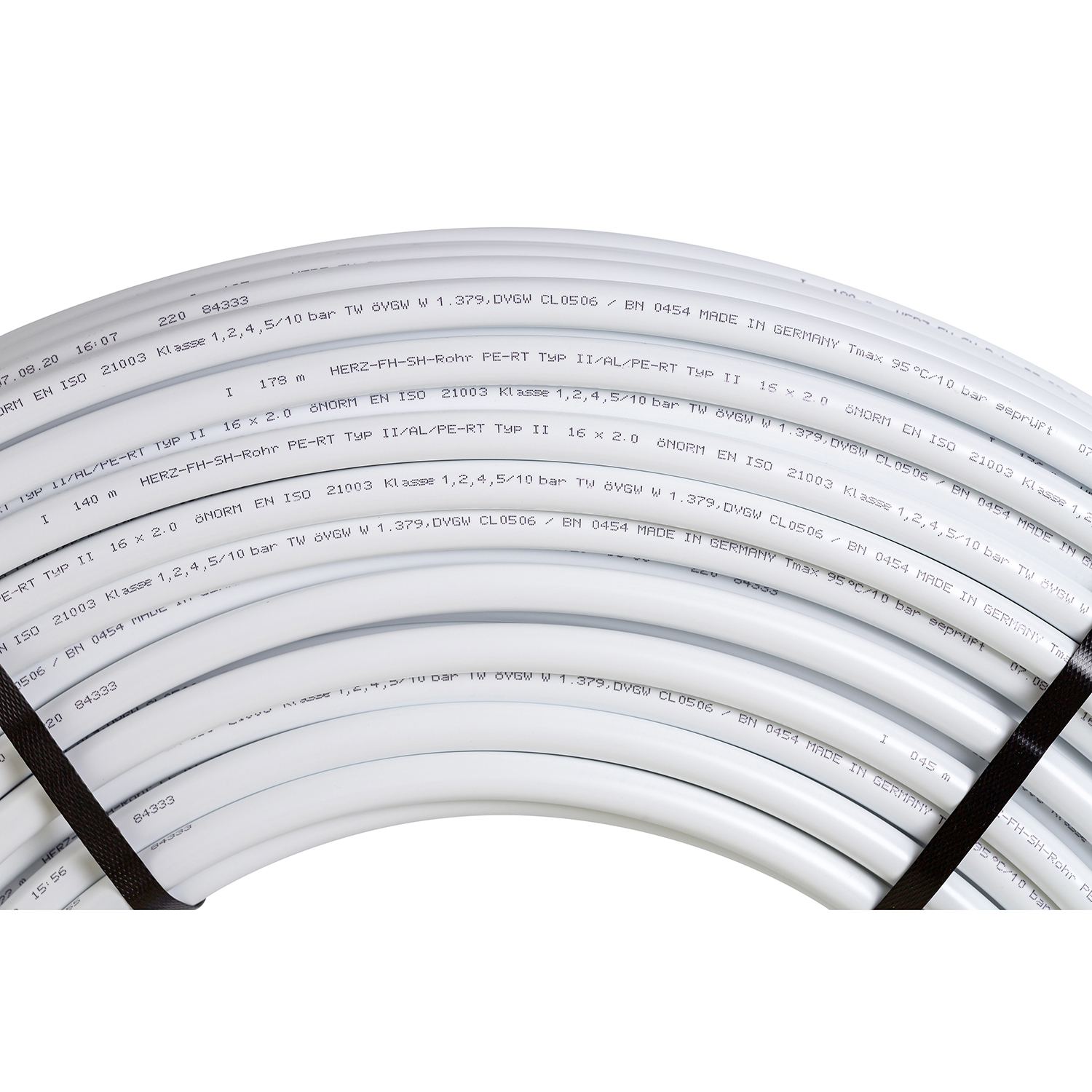 Труба металлопластиковая Herz. Диаметр — 16 мм, толщина стенки — 2,0 мм. Длина в бухте — 200 метров. Материал: металлопластик, устойчивый к коррозии. Рабочая температура: до 95°C. Давление: 6 бар. Применение — водоснабжение, отопление. Устойчивость к ультрафиолету — средняя. Гибкость — высокая. Рекомендованная температура монтажа — от 5°C. Соединение: пресс-фитинги. Сертификация: ISO 9001. Гарантия — 10 лет. Цвет: белый. Упаковка — рулон. Вес — 15 кг. Не подлежит ремонту. Хранить в сухом, защищенном от солнечного света месте.