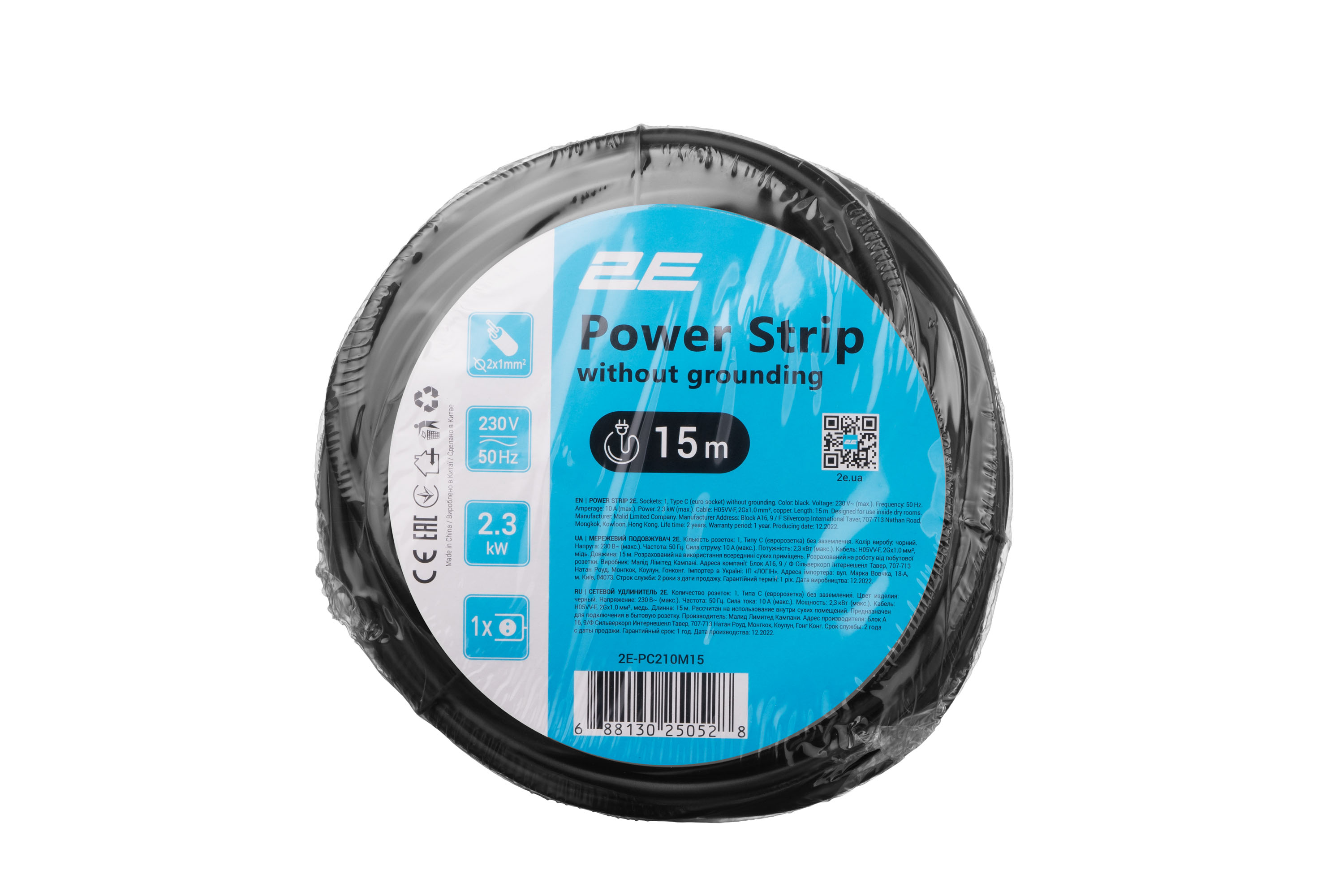 Мережевий подовжувач 2E модель PC210M15 призначений для підключення офісної та побутової техніки сумарною потужністю до 2,5 кВт. Має одну розетку типу CEE7/17 без заземлення (євророзетка/євровилка), двожильний кабель із перерізом жили 1 мм², матеріал провідника – мідь. Чорного кольору, довжина кабелю 15 м.