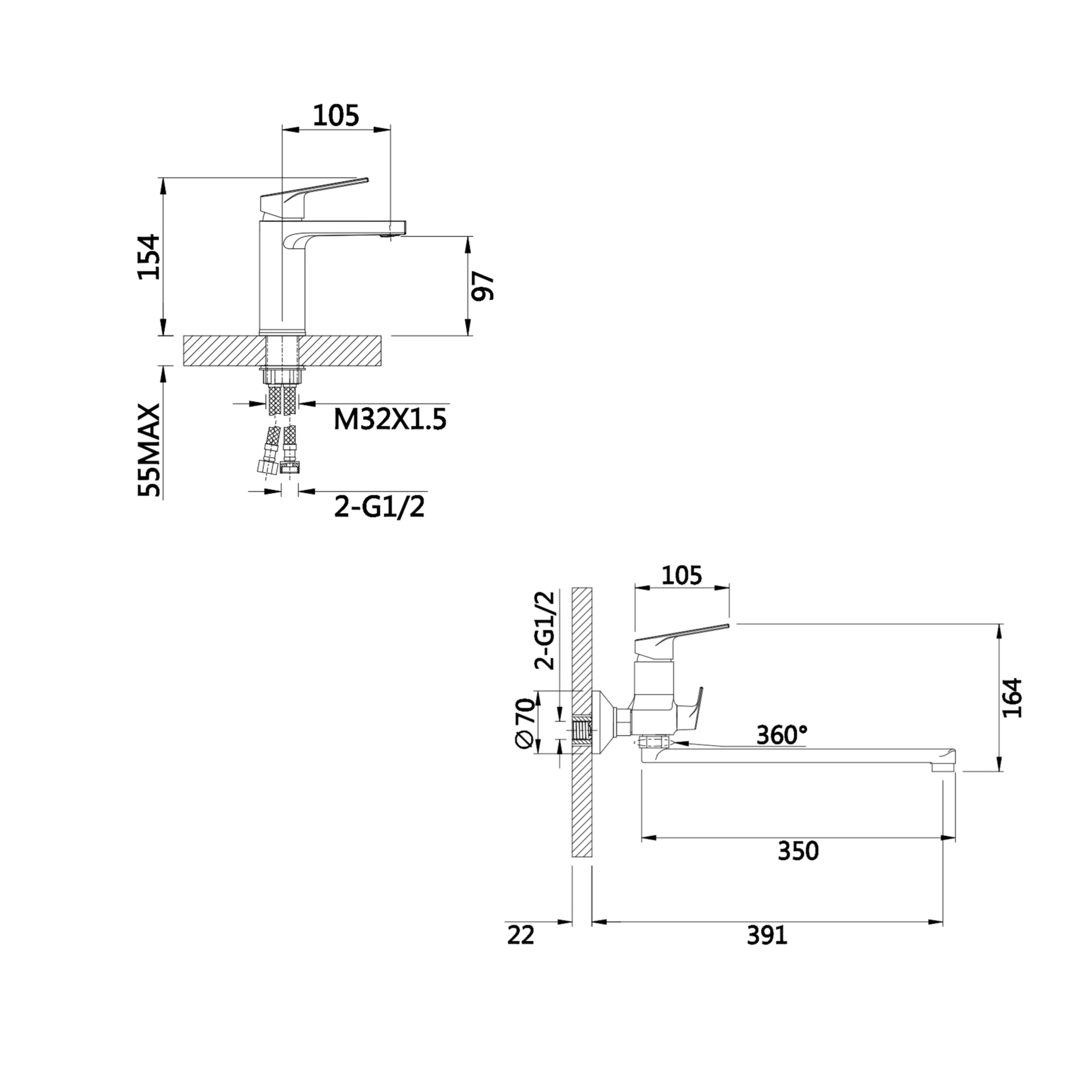 - 1,395 - смеситель для раковины; 2,7 - смеситель для ванны
