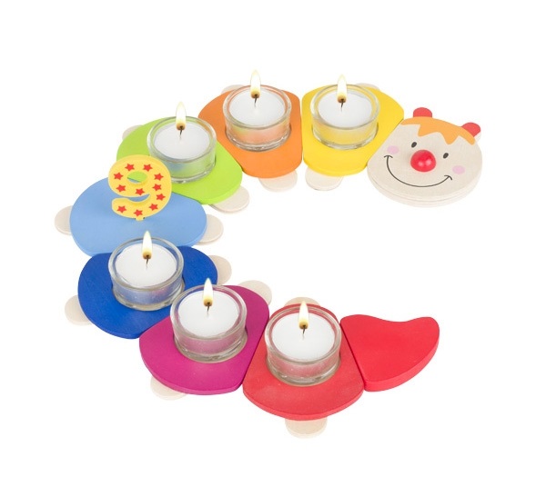 День народження – завжди дуже очікуване та яскраве свято. Напевно, немає жодної людини, яка хоча б раз у житті не задувала свічки на святковому торті, загадуючи бажання. Адже це одна із тих деталей, що відрізняє день народження від інших свят. Підставка для свічок «Гусінь Каміла» – практичний аксесуар для будь-якого дня народження. Набір складається з 8 різнокольорових яскравих вагончиків, кожен з них має підсвічник. На середній елемент потягу кріпиться цифра, що означає вік іменинника. Аксесуар виготовлений з дерева, тому є повністю безпечним для дітей. В комплект входять 10 окремих цифр, тому підставка для свічок буде атрибутом свята не один рік.