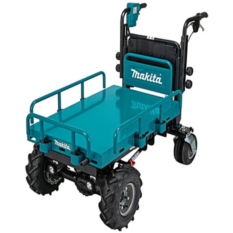 Опис: Акумуляторна самохідна тачка MAKITA DCU601ZАкумуляторний візок Makita DCU601Z – надійний помічник для важких робіт. Він працює на платформі 18В X2 LXT (36В), що забезпечує високу потужність і дозволяє перевозити вантажі до 300 кг навіть на складному рельєфі. DCU601Z оснащений інноваційною системою регулювання швидкості та має два режими руху для безпечного транспортування. Світлодіодне підсвічування підвищує видимість у темряві, а функція реверсу спрощує маневрування в обмежених просторах. Це ідеальний вибір для будівельних, садових та сільськогосподарських робіт.Комплект поставки:Зверніть увагу, акумулятор і зарядний пристрій в комплект поставки не входять.Переваги для користувача:- безщітковий електричний двигун забезпечує більш ефективну роботу та продовжує термін служби пристрою- працює на двох Li-ion LXT акумуляторах Makita LXT напругою 36 В- три швидкісних режими вперед (1.5, 3, 5 км/год) та один назад (1 км/год)- регулювання висоти керма дозволяє встановити кермо в зручне положення- чотири міцні колеса - стійкість і маневреність при пересуванні по нерівній поверхні- захищений від бризок води з усіх боків (ступінь захисту IPX4)- обладнаний світлодіодним ліхтарем червоного кольору позаду та двома світлодіодними фарами спереду