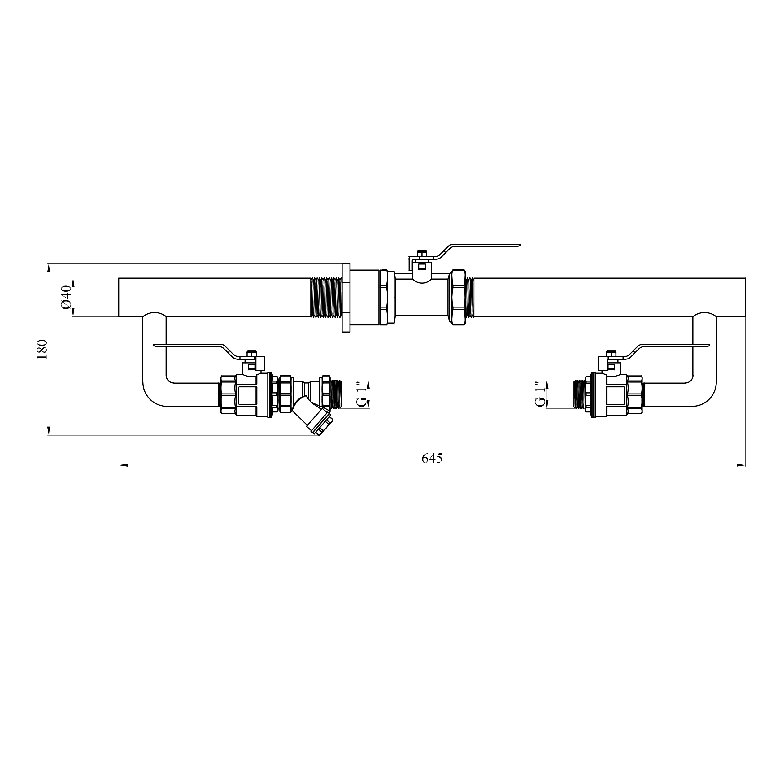 - Ширина главной магистрали: 40 мм. Длина одного плеча байпаса: 330 мм. Запорный механизм: шаровой. Способ перекрытия: кран (вручную).
