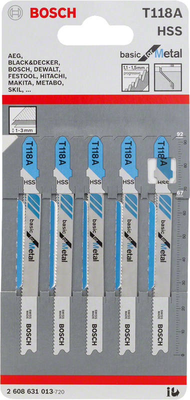 Резка в листовом металле – Полотно для лобзиков T 118 A Basic for Metal образует прямые прорези в металле. Его фрезерованные зубцы в форме волны идеально подходят для резки без особых требований. Закаленное лезвие из высококачественной быстрорежущей стали режет неперфорированные листы металла стандартной жесткости. Полотно с прогрессивным сверхмалым шагом зубцов (1,1–1,5 мм) разрезает тонкие сплошные листы металла 1–3 мм толщиной. Для использования с лобзиками с системами крепления Т-образных хвостовиков. Подходит для всех лобзиков с Т-образным хвостовиком Холст для лобзиков T 118 A Basic for Metal образует прямые прорези в металле - Для использования с лобзиками с системами крепления Т-образных хвостовиков. Подходит для всех лобзиков с Т-образным хвостовиком Резка в сплошном листовом металле Холст для лобзиков T 118 A Basic for Metal образует прямые прорези в металле. Фрезерованные зубцы в форме волны идеально подходят для резки без особых требований. Закаленное лезвие из высококачественной быстрорежущей стали режет неперфорированные листы металла Полотно с прогрессивным сверхмалым шагом зубцов (1,1–1,5 мм) режет тонкие сплошные листы металла 1–3 мм толщиной