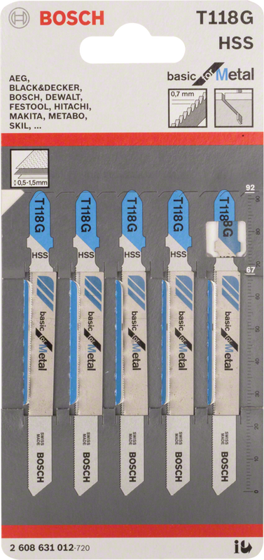 Резка в листовом металле - Полотно для лобзиков T 118 G Basic for Metal образует прямые прорези в металле. резать очень тонкие сплошные листы металла толщиной 0,5–1,5 мм. Полотно для лобзиков T 118 G Basic for Metal образует прямые прорези в металле - Для использования с лобзиками с системами крепления Т-образных хвостовиков. Резка в сплошном листовом металле Холст для лобзиков T 118 G Basic for Metal образует прямые прорези в металле. Фрезерованные зубцы в форме волны идеально подходят для резки без особых требований. Закаленное лезвие из высококачественной быстрорежущей стали режет неперфорированные листы металла Сверхмалый шаг зубцов (0,7 мм) позволяет резать тонкие сплошные листы металла 0,5–1,5 мм толщиной.