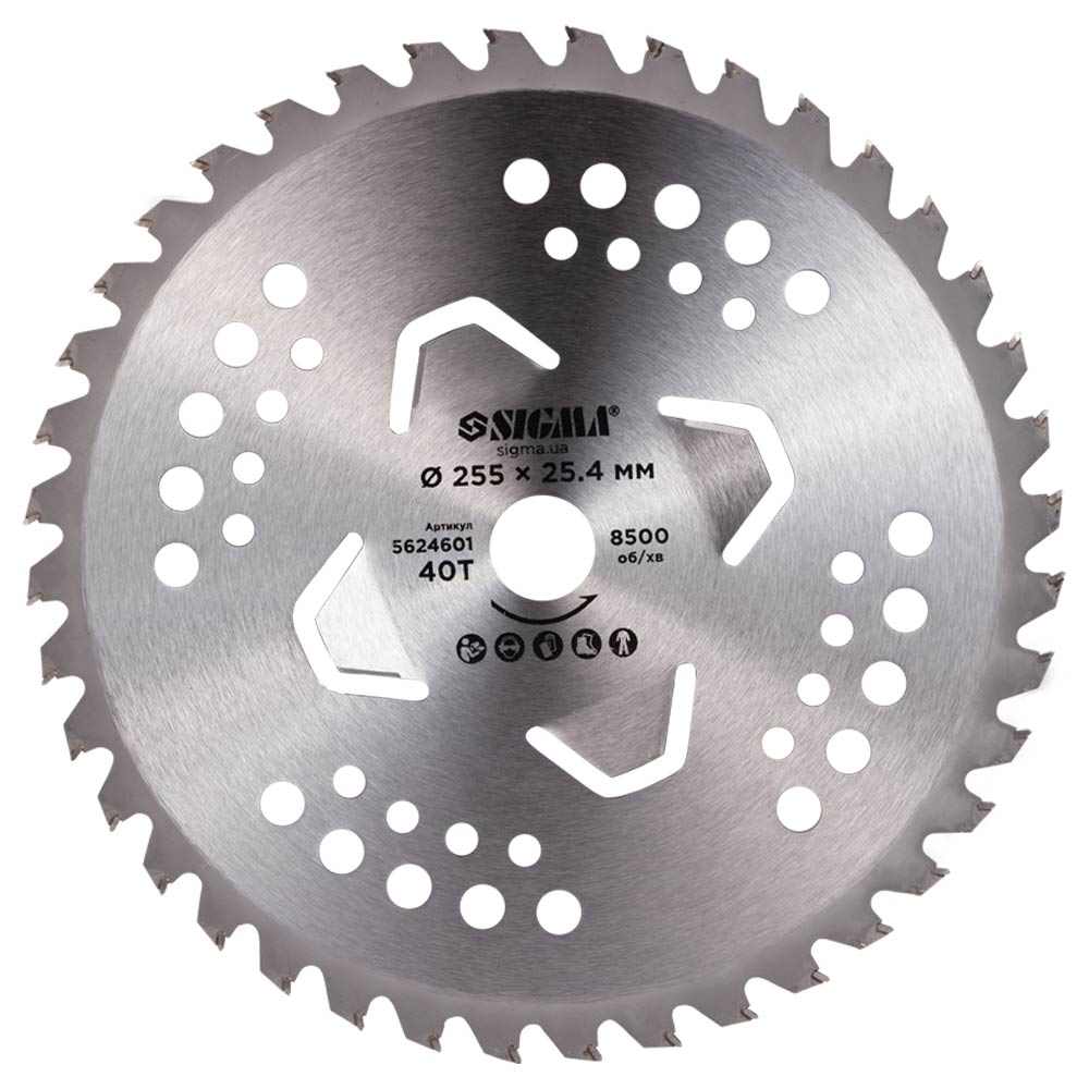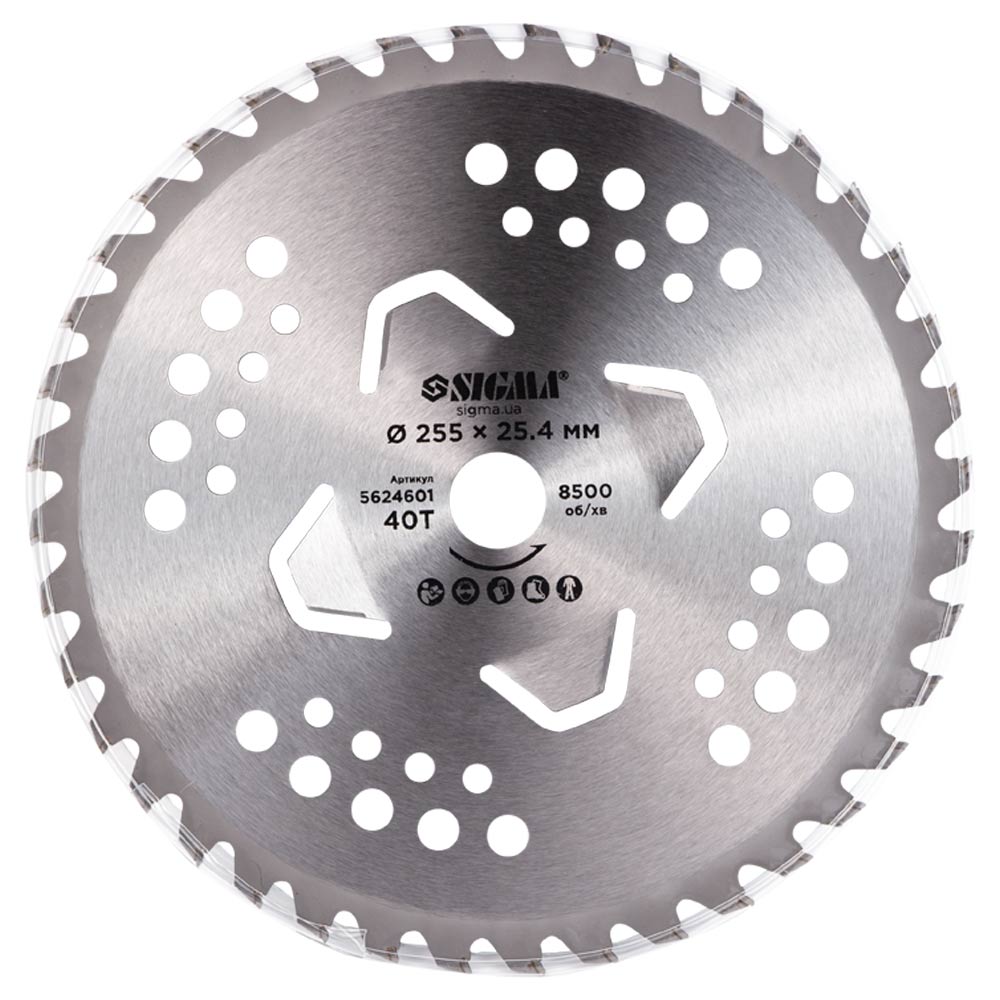 Диск для триммера SIGMA 255 мм, 25.4 мм, 40 зубців з твердосплавними напайками. Ідеальний для скошування трави та чагарників, забезпечує високу продуктивність і довговічність.