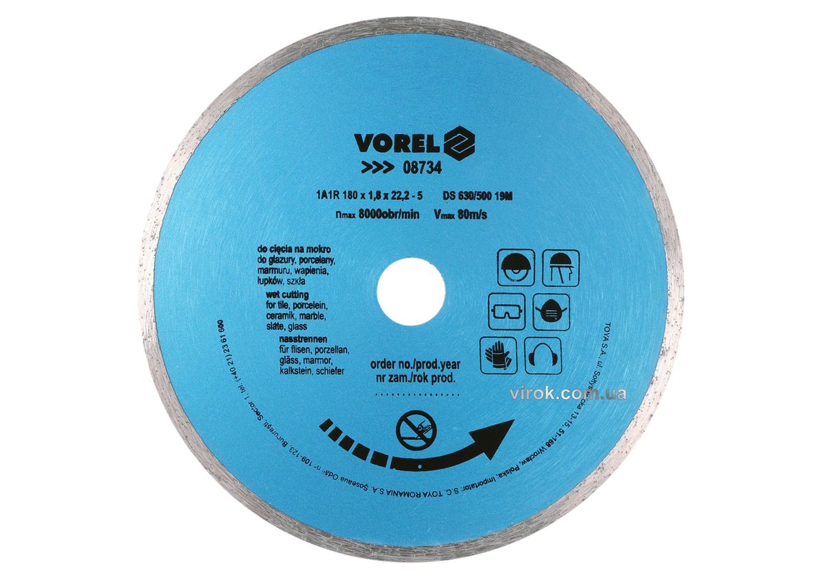 Опис Диск відрізний алмазний суцільний VOREL : Ø= 180 мм [15/60] код товару 08734