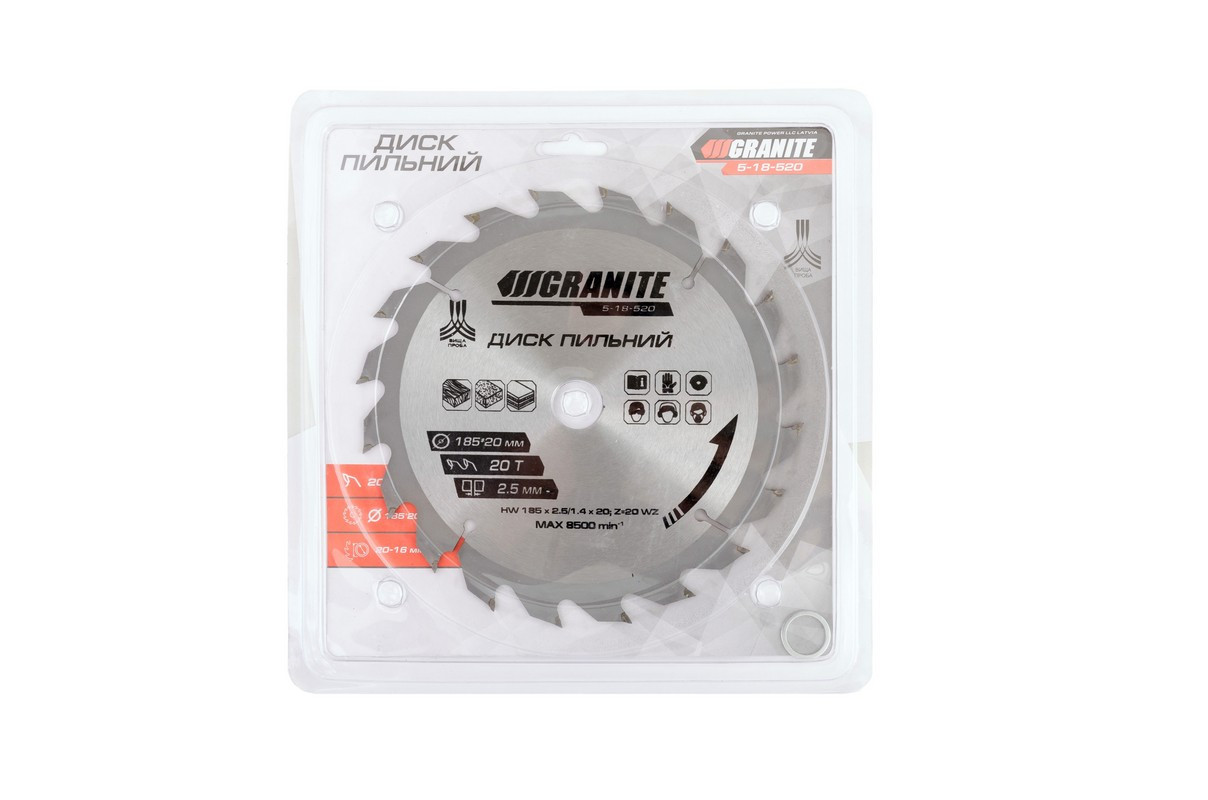 Опис Диск пильний GRANITE для дерева з твердосплавними напайками 185х20х20Т адаптер 20-16 8200 об/хв 5-18-520 код товару 5-18-520