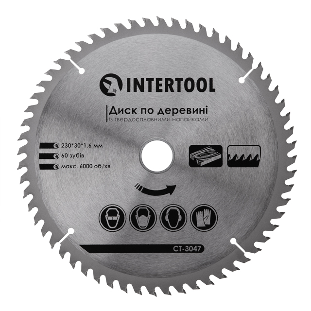 Опис Диск пильний по дереву з твердосплавними напайками 230x30x1,6 мм; 60 зубів INTERTOOL CT-3047 код товару CT-3047