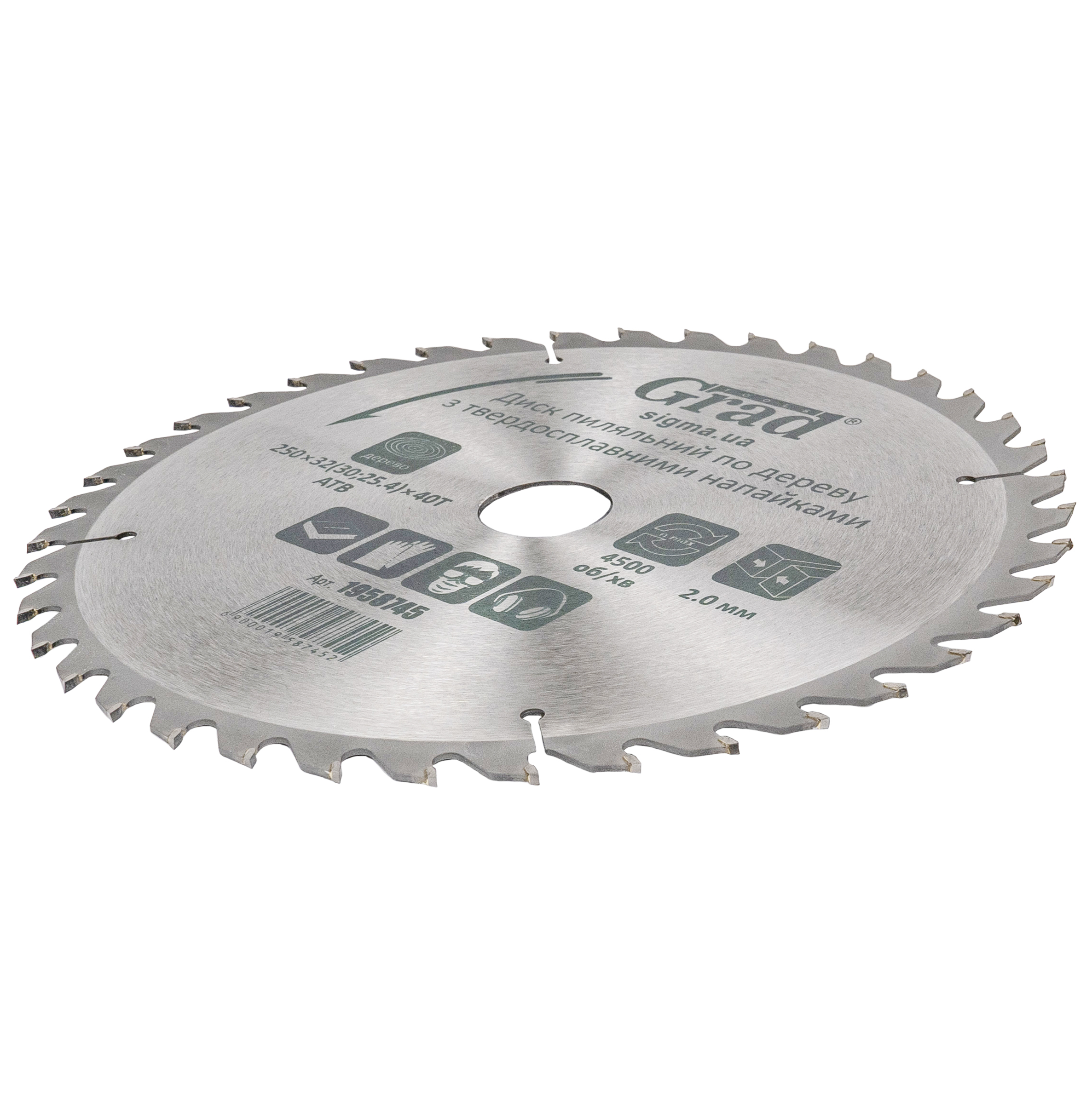Характеристики Диск пильний по дереву з твердосплавними напайками 250*32(30;25.4)*40T GRAD (1958745) код товару 1958745