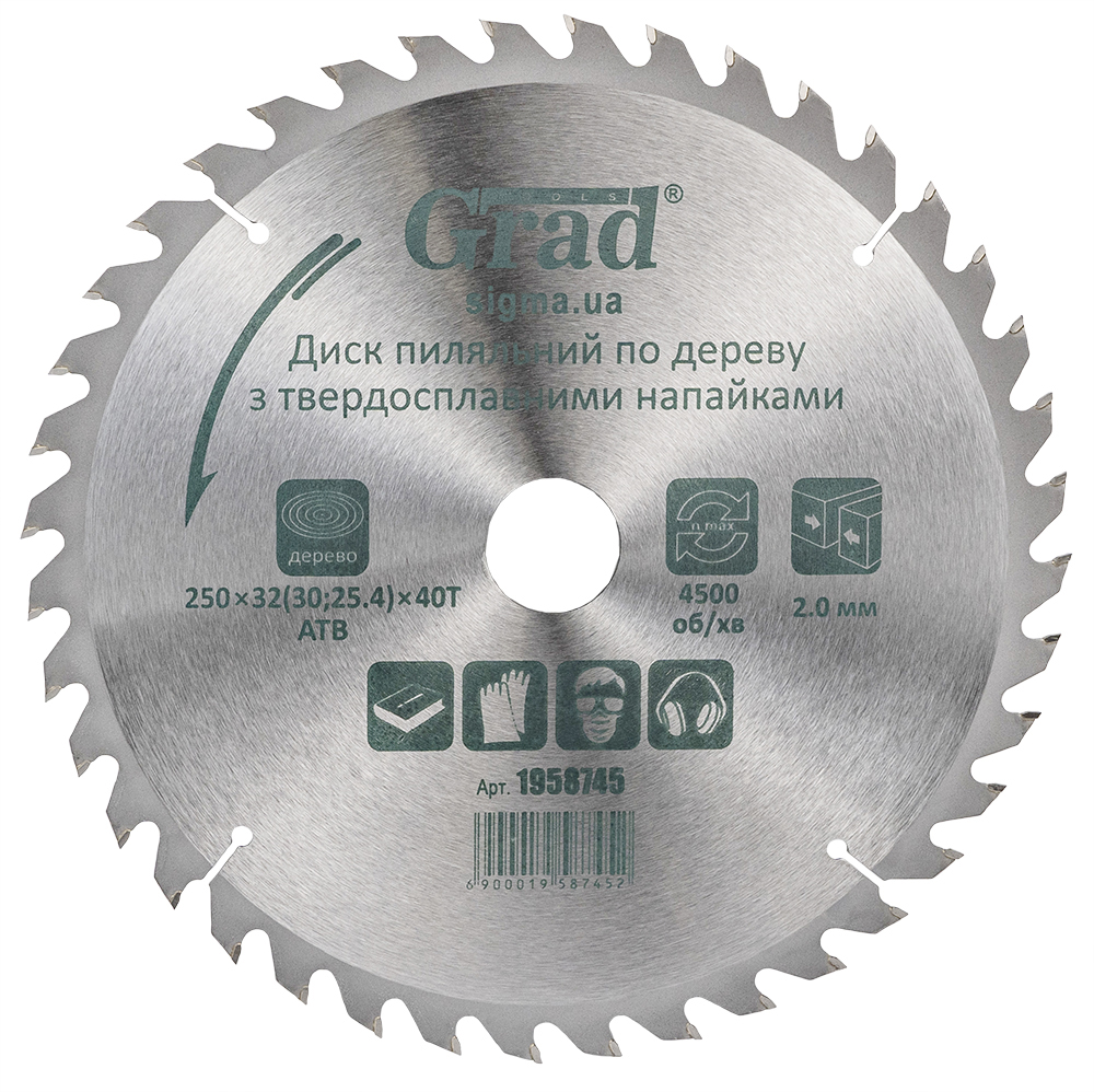 Опис Диск пильний по дереву з твердосплавними напайками 250*32(30;25.4)*40T GRAD (1958745) код товару 1958745