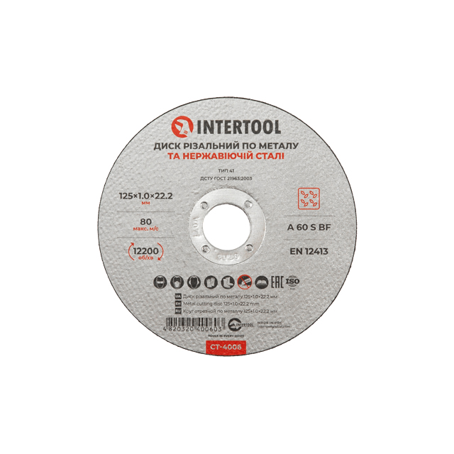 Характеристики Диск отрезной по металлу 125x1,0x22,2 мм INTERTOOL CT-4006 код товару CT-4006