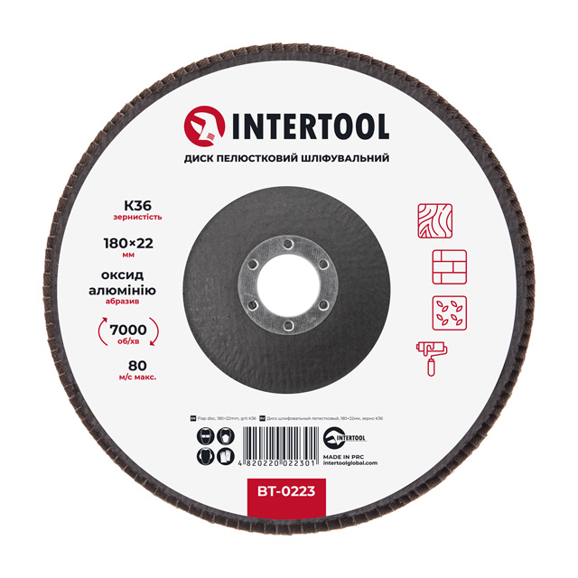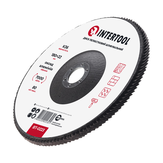 Характеристики Диск шлифовальный лепестковый 180x22 мм, зерно K36 INTERTOOL BT-0223 код товару BT-0223