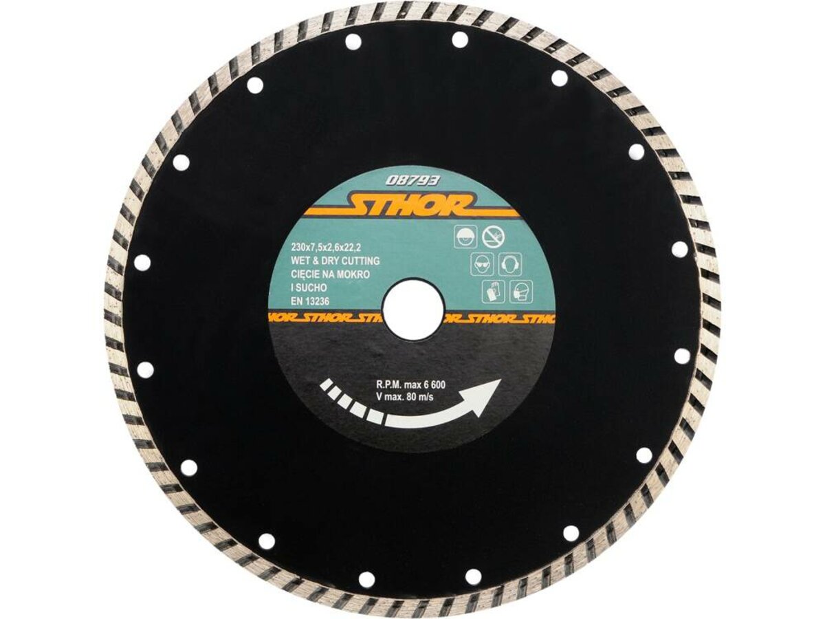 Характеристики Диск відрізний алмазний TURBO STHOR Ø= 230 мм, t-2,6 х h-7,5 мм по каменю, бетону, кераміці код товару 08793