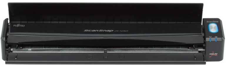 Fujitsu ScanSnap iX100 (PA03688-B001) – ультракомпактна протяжна модель, укомплектована літій-іонною батареєю, яка розрахована на 260 операцій із документами, що мають формат А4. Пристрій має вагу 400 г, його легко і зручно транспортувати.