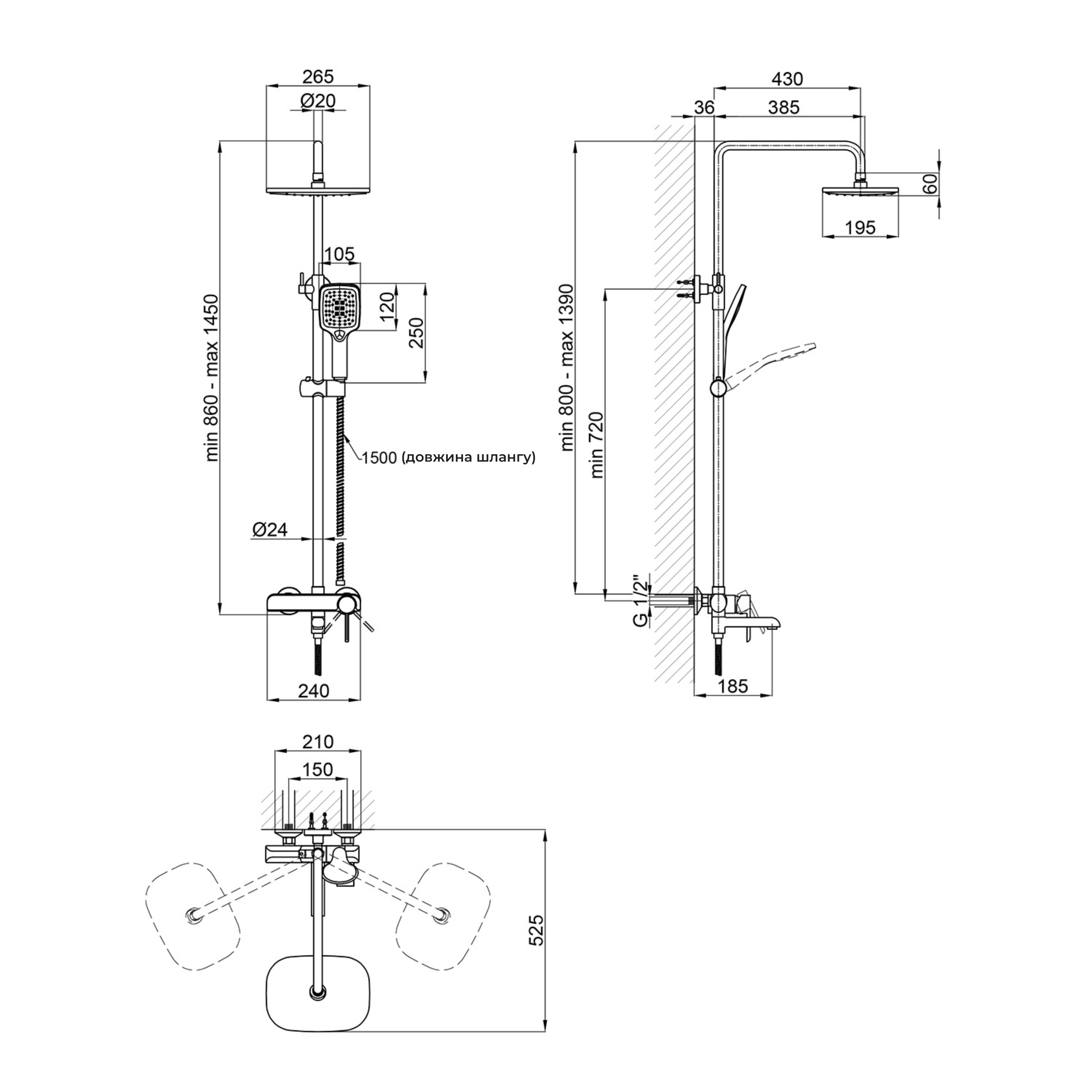 Ручний душ: 3 режими, натиск - до 3 бар. Шланг: 1.5 м, гнучкий. Штанга: регульована, з кріпленням. Розмір упаковки: 70x15x10 см. Відповідає стандартам якості. Вартість: 1500 грн.