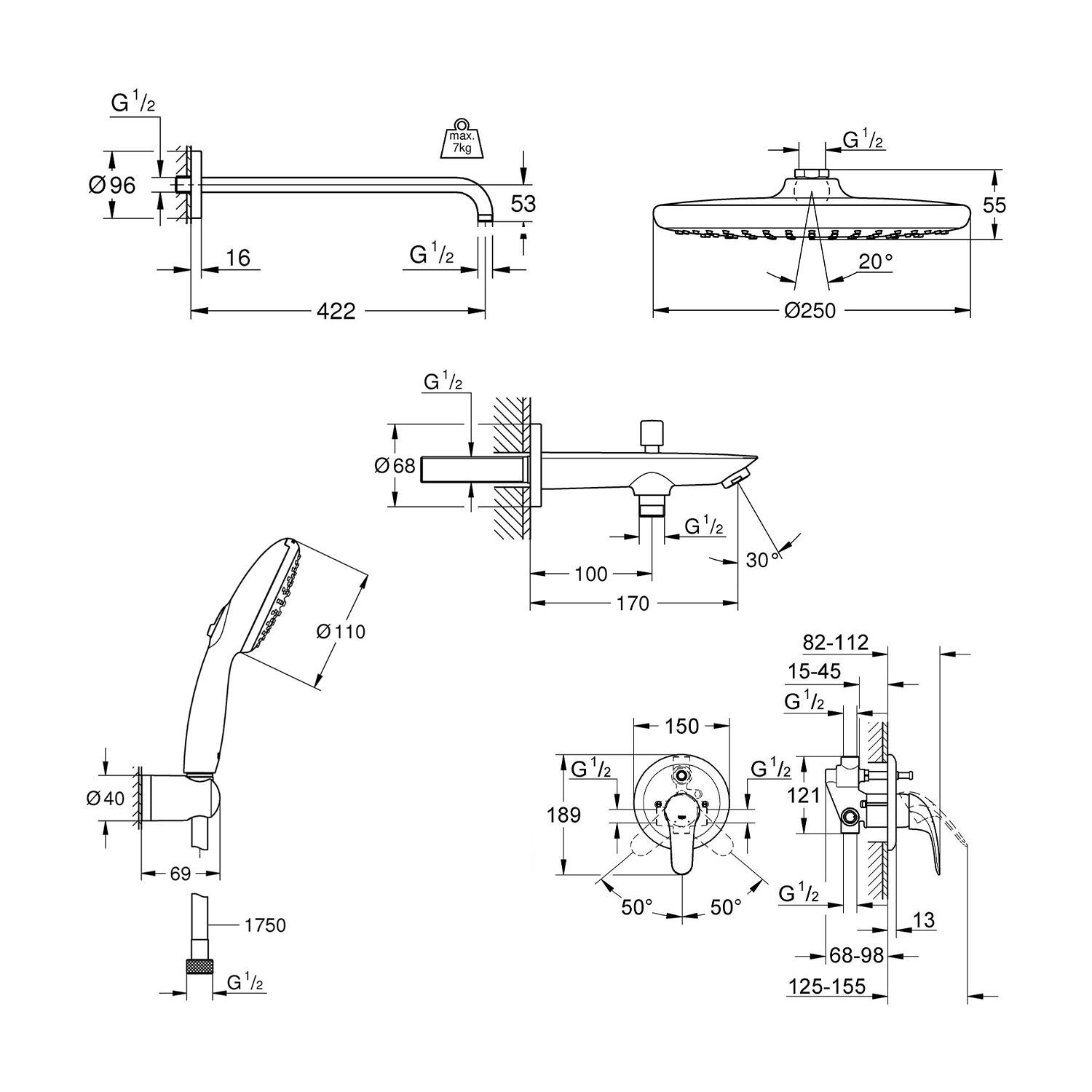 Душевая система Grohe Vitalio Start 250 с изливом для ванны и смесителем Euroeco (комплект 5 в 1) RU32747R3