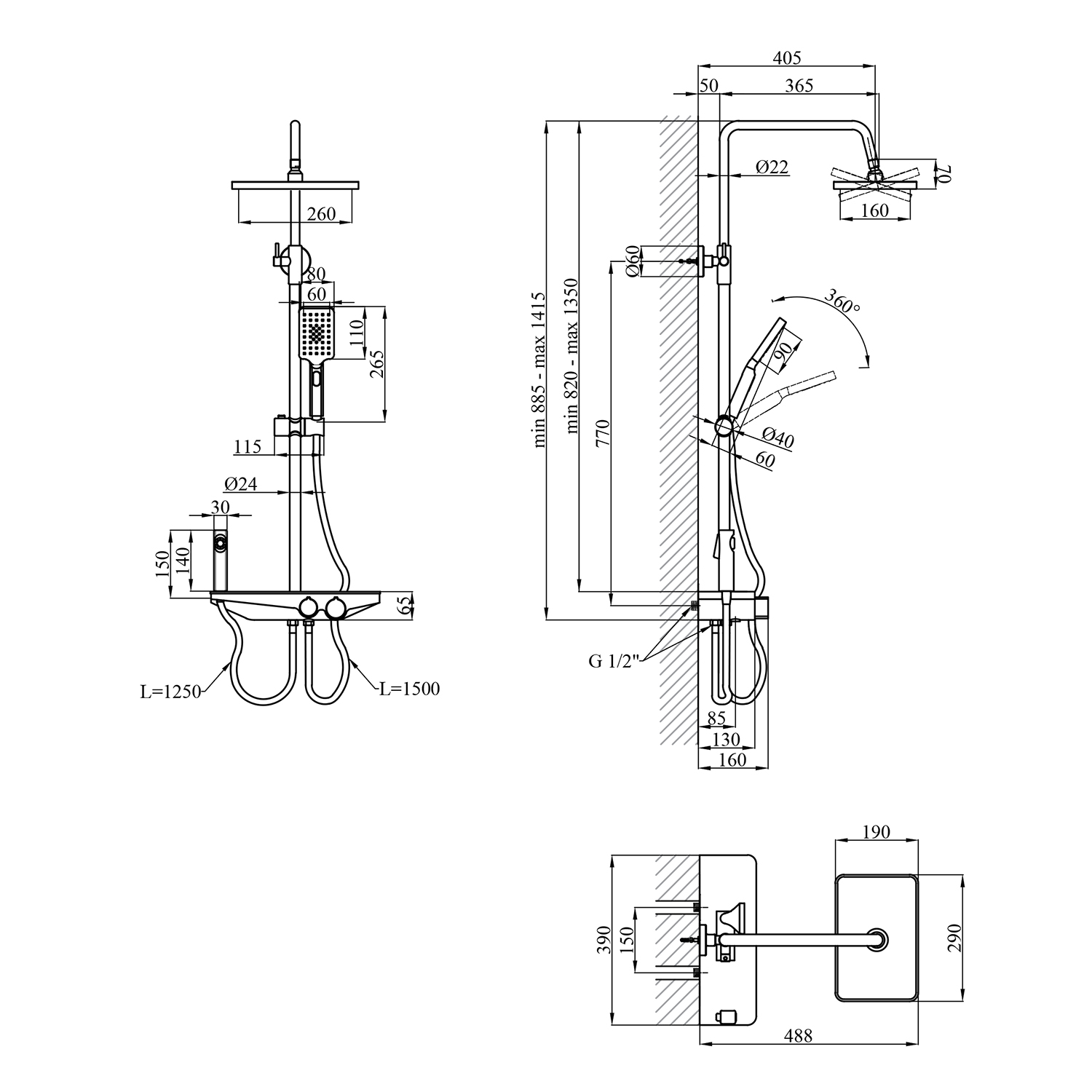 - Регулируемый по высоте держатель для ручной лейки. Гигиенический душ со шлангом длиной 1250 мм. Отвод для подключения душевого шланга под диаметр 1/2".