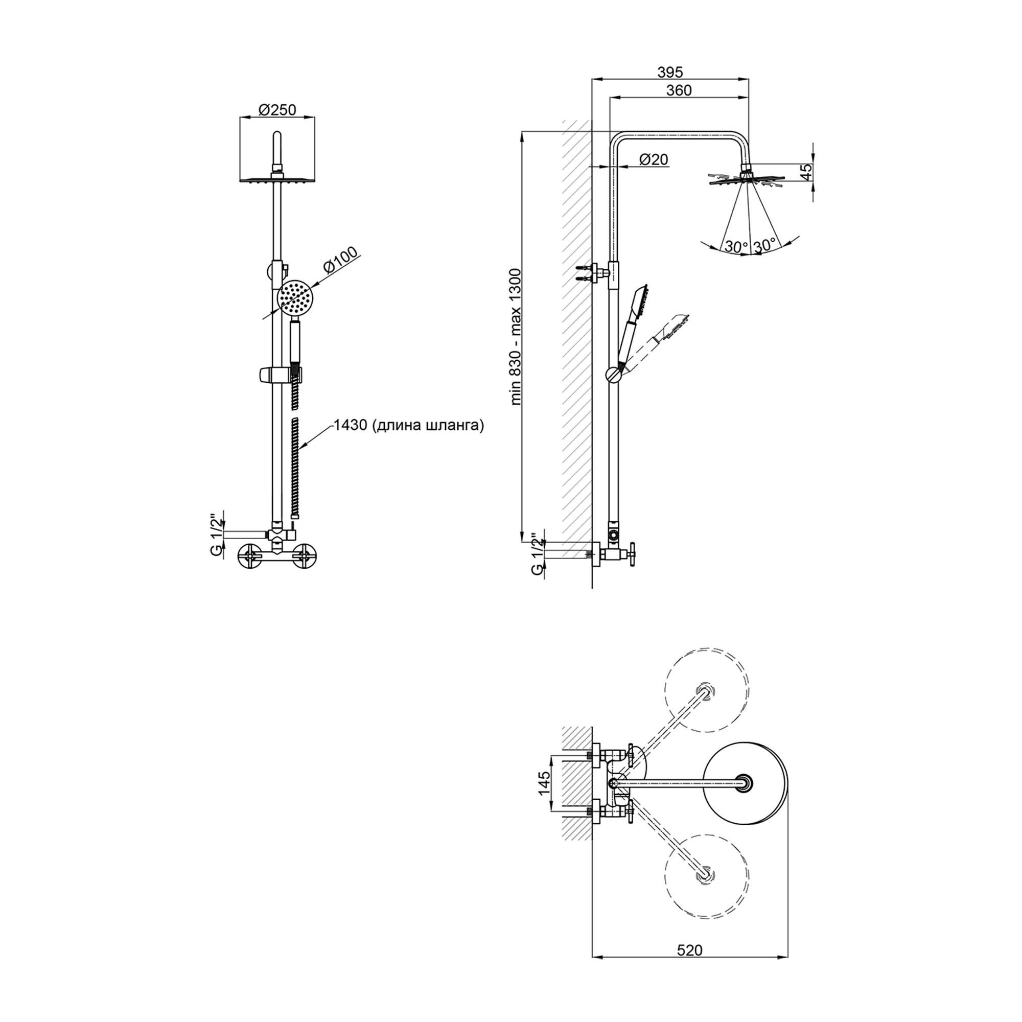 - Ручний душ 100. Верхній душ 250