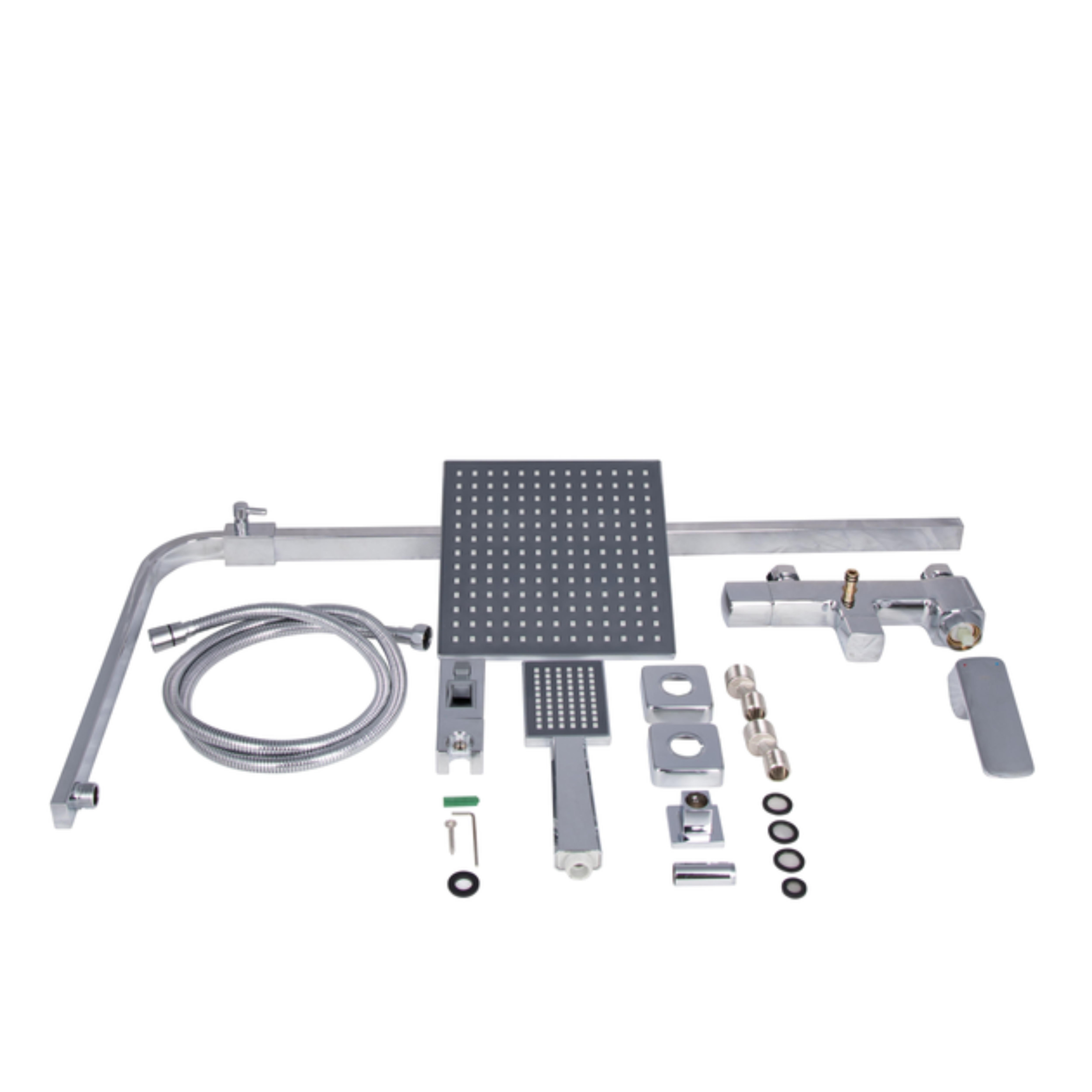 - Настенный смеситель с переключателем, верхний душ квадратной формы, ручная лейка, душевой шланг, штанга с регулируемым держателем для лейки, крепёжные элементы и уплотнительные кольца.
