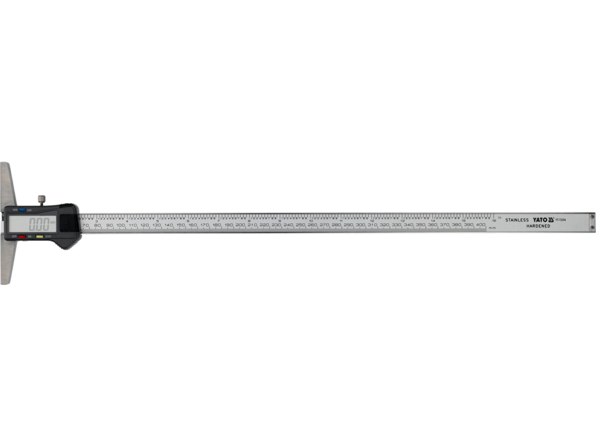 Опис Глибиномір повзунк електронний YATO l= 400 мм, точність ±0.03 мм, живлення від батарейки SR44 1.55 V код товару YT-72254