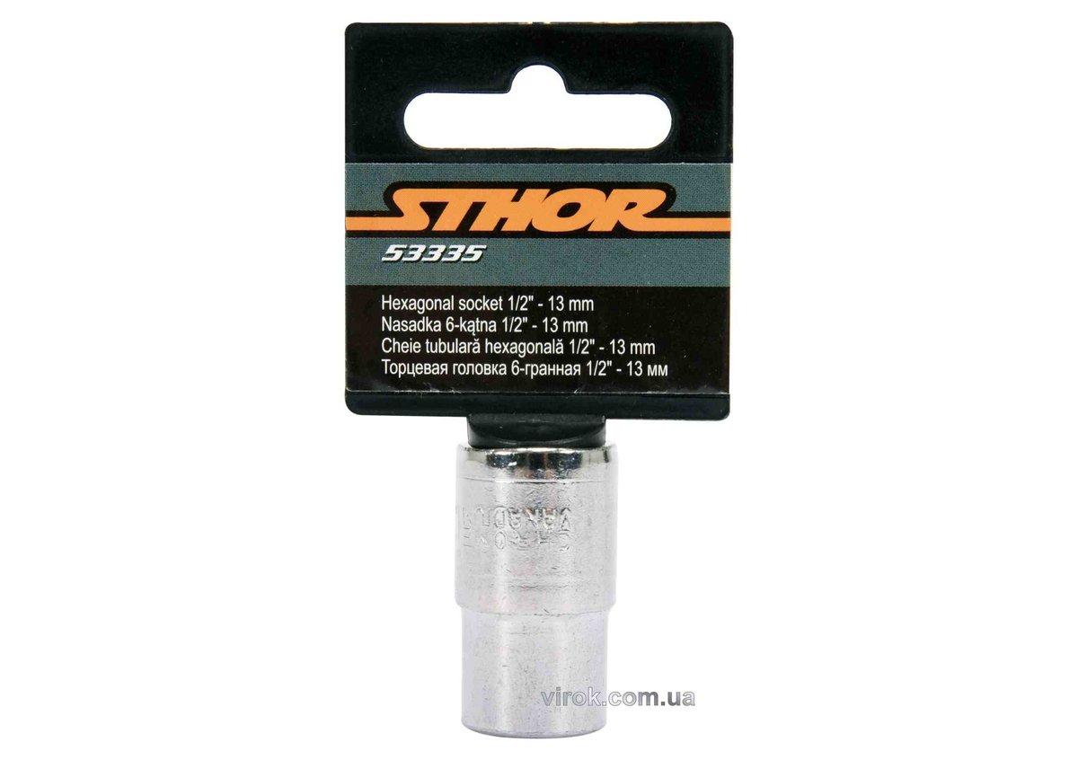 Головка торцева 6-гранна STHOR, квадрат 1/2", розмір М13, виготовлена з вуглецевої сталі. Ідеальна для ремонтних робіт. Упакована в блістер. Надійний інструмент для професіоналів.