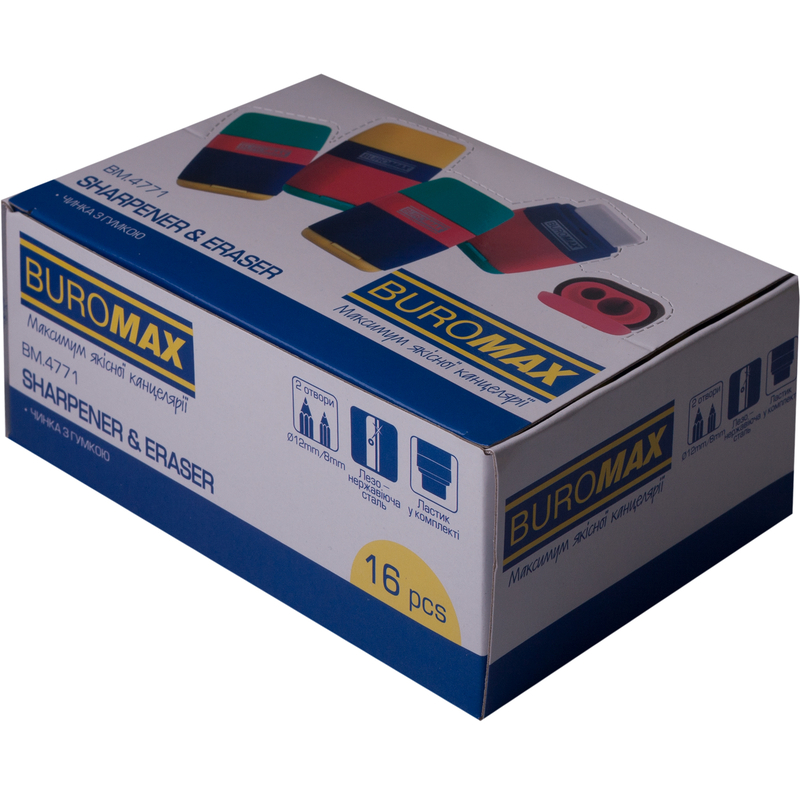 Характеристики Гумка + Чинка RAINBOW, RUBBER TOUCH, 2 отв., контейнер, пластик.корпус Rubber Touch. безпечне лезо. два режими заточування. з гумкою код товару BM.4771