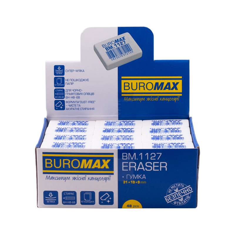 Прямоугольный ластик из мягкого пластика, который стирает чернографитовые карандаши твердостью 6Н-HB-6В с любых видов бумаги, в том числе, с тонких сортов, не оставляя разводов и не повреждая бумагу.