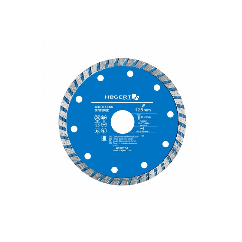 Опис Диск алмазний відрізний 125 х 2 х 22,3 мм турбо, граніт, цегла, камінь, бетон HOEGERT HT6D754 код товару HT6D754