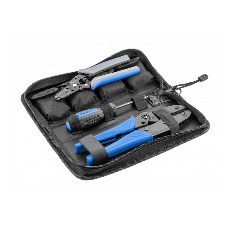 Набір для обтискання клем HOEGERT HT1P177 містить 6 універсальних інструментів для надійного з'єднання проводів. Ідеальний для електромонтажних робіт та ремонту.