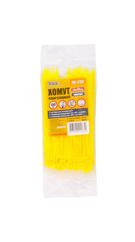 Опис Хомут пластиковий MASTERTOOL 2.5х150 мм 100 шт жовтий 20-1720 код товару 20-1720