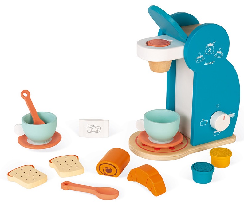 Завдяки цим аксесуарам маленькі кухарі відчуватимуть себе професіоналами при приготуванні сніданку. Дитяча кавоварка має регульований рівень тиску "" води "", в неї можна вставити капсули, а діти можуть приготувати справжню каву. Завдяки дерев'яній іграшці розвивається дитяча уява, дрібна моторика і діти стають ближче до світу дорослих. Рекомендований вік: 3+.