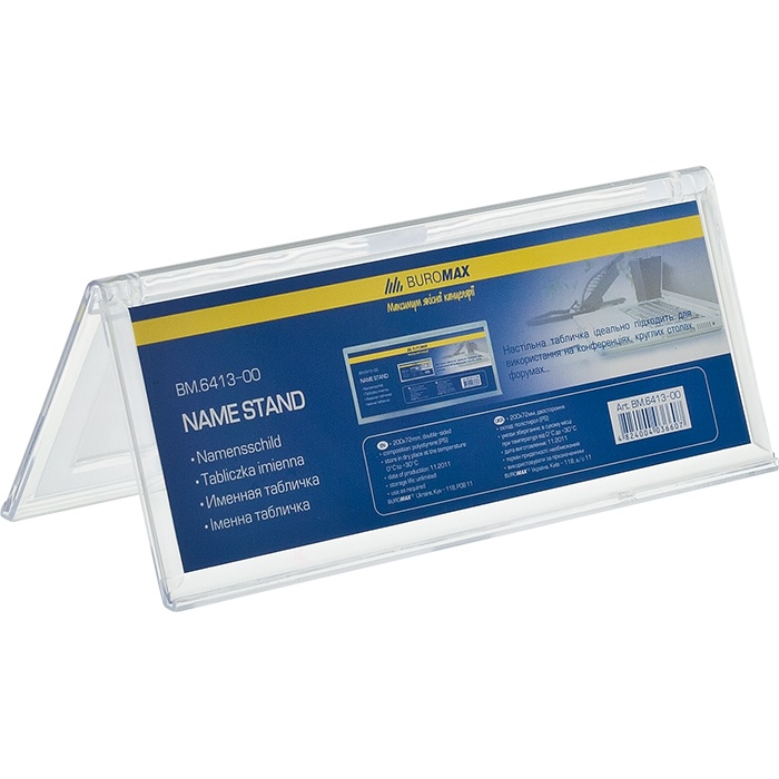 Іменна табличка BUROMAX – помічник під час проведених конференцій, семінарів, презентацій, круглих столів. Також, використовується в ресторанах та кафе для демонстрації спеціальних меню, «гарячих пропозицій», а в готелях та офісах – для позначення столика рецепції та адміністратора. Поліграфічна вкладка просто змінюється, а прозорий полістирол, з якого зроблена табличка BUROMAX, не спотворює кольору і чіткість зображень.