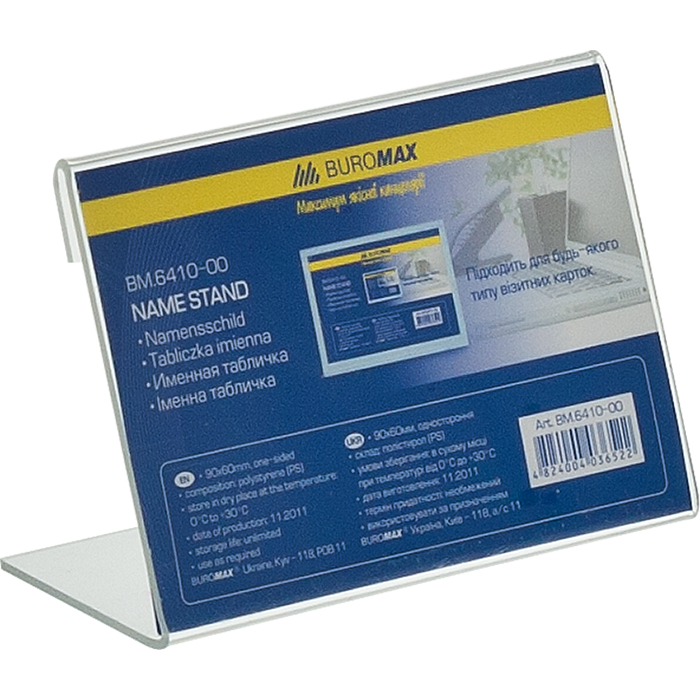 Іменна табличка BUROMAX – помічник під час проведення конференцій, семінарів, презентацій, круглих столів. Також застосовується в ресторанах та кафе для демонстрації спеціальних меню, «гарячих пропозицій», а в готелях та офісах – для позначення столика рецепції та адміністратора. Поліграфічна вкладка легко змінюється, а прозорий полістирол, з якого виготовлена табличка BUROMAX, не спотворює кольору і чіткість зображень.