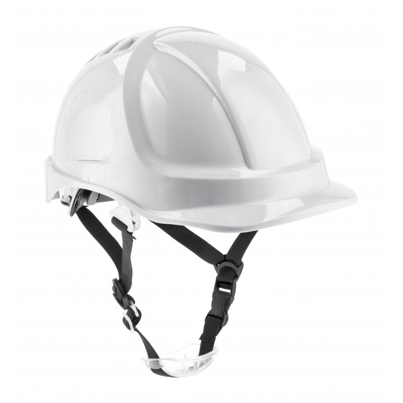 Захисна каска з ABS пластику має вентиляційні отвори, отвори для кріплення навушників. Крім того, бічні кріплення служать для кріплення додаткових засобів захисту обличчя, очей та слуху. Корпус зберігає удароміцність при низьких температурах, має високу твердість і стійкість. до подряпин. 6-точкові шлейки виготовлені з високоміцної поліестерової тасьми і не натерають, як пластикові шлейки. Регулювання на задній частині шолома, виготовлене з нейлону, забезпечує ідеальну посадку для голови будь-якого розміру. Оснащений 4-точковим ременем підборіддя. Відмінно підходить для умов, що потребують ефективного захисту, відмінної вентиляції та максимального поля зору. Виготовлена відповідно до EN 397 та призначена для професійного використання.