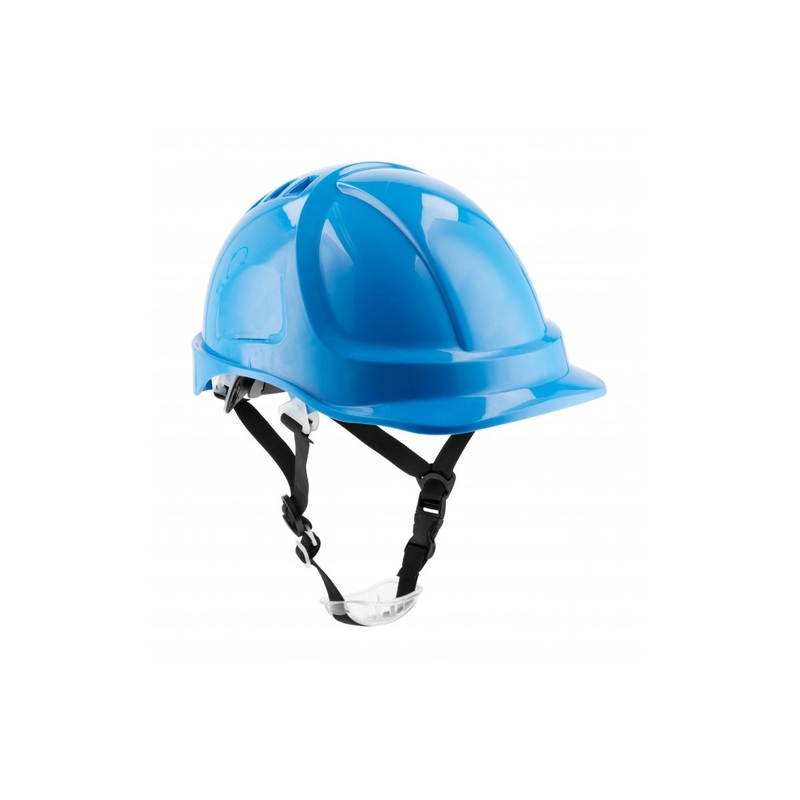Захисна каска з ABS пластику має вентиляційні отвори, отвори для кріплення навушників. Крім того, бічні кріплення служать для кріплення додаткових засобів захисту обличчя, очей та слуху. Корпус зберігає удароміцність при низьких температурах, має високу твердість і стійкість. до подряпин. 6-точкові шлейки виготовлені з високоміцної поліестерової тасьми і не натерають, як пластикові шлейки. Регулювання на задній частині шолома, виготовлене з нейлону, забезпечує ідеальну посадку для голови будь-якого розміру. Оснащений 4-точковим ременем підборіддя. Відмінно підходить для умов, що потребують ефективного захисту, відмінної вентиляції та максимального поля зору. Виготовлена відповідно до EN 397 та призначена для професійного використання.