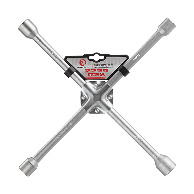 Характеристики Ключ балонний хрестовий укріплений 16 406мм, 16мм, 17мм, 19мм, 21мм, 22мм INTERTOOL HT-1597 код товару HT-1597